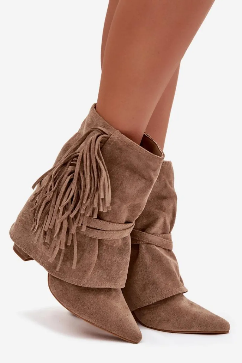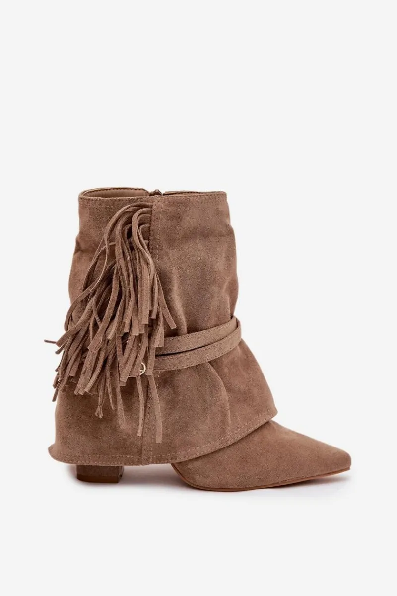 Damskie botki z eko zamszu to idealne połączenie stylu i oryginalnych detali, które przyciągają uwagę. Cholewka nachodząca na obcas subtelnie wysmukla sylwetkę, a szpiczaste noski dodają elegancji i kobiecego charakteru. Model ozdobiony frędzlami oraz cienkimi paseczkami ze złotymi klamrami wprowadza modowy akcent, nadając wyjątkowego, nowoczesnego wyglądu. Botki doskonale sprawdzą się w casualowych zestawach, jak i w bardziej wyjściowych stylizacjach, wprowadzając do nich nutę oryginalności i szyku. Komfortowe i efektowne, stanowią świetny wybór na co dzień i na specjalne okazje.Przy wyborze rozmiaru prosimy sugerować się tabelą rozmiarów.
