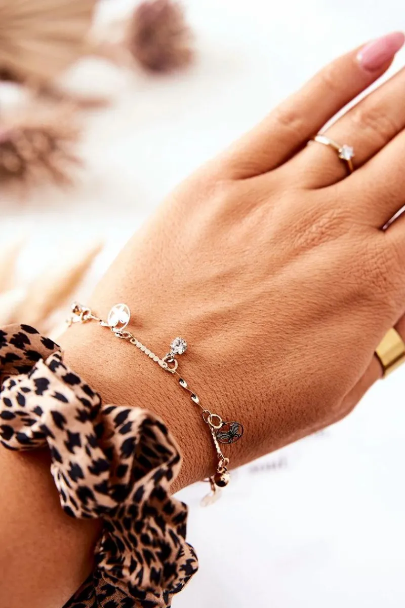 Bransoletka z ozdobnymi zawieszkami w postaci cyrkonii oraz motywu motyla. Została wykonana z metalu nieszlachetnego. Posiada możliwość regulacji długości. Cienki łańcuszek w bransoletce bardzo dobrze prezentuje się na nadgarstku. Nie czekaj aż zniknie i kup już dziś! Ten model musi być Twój!