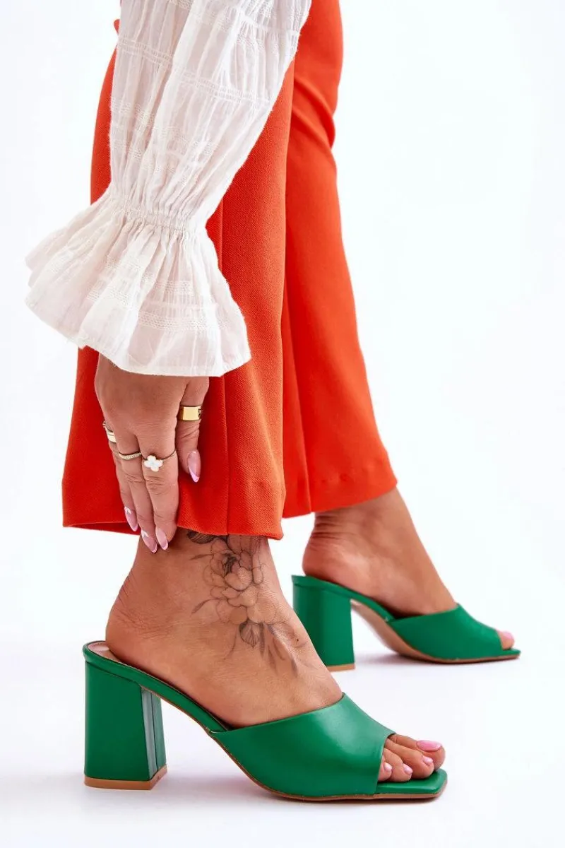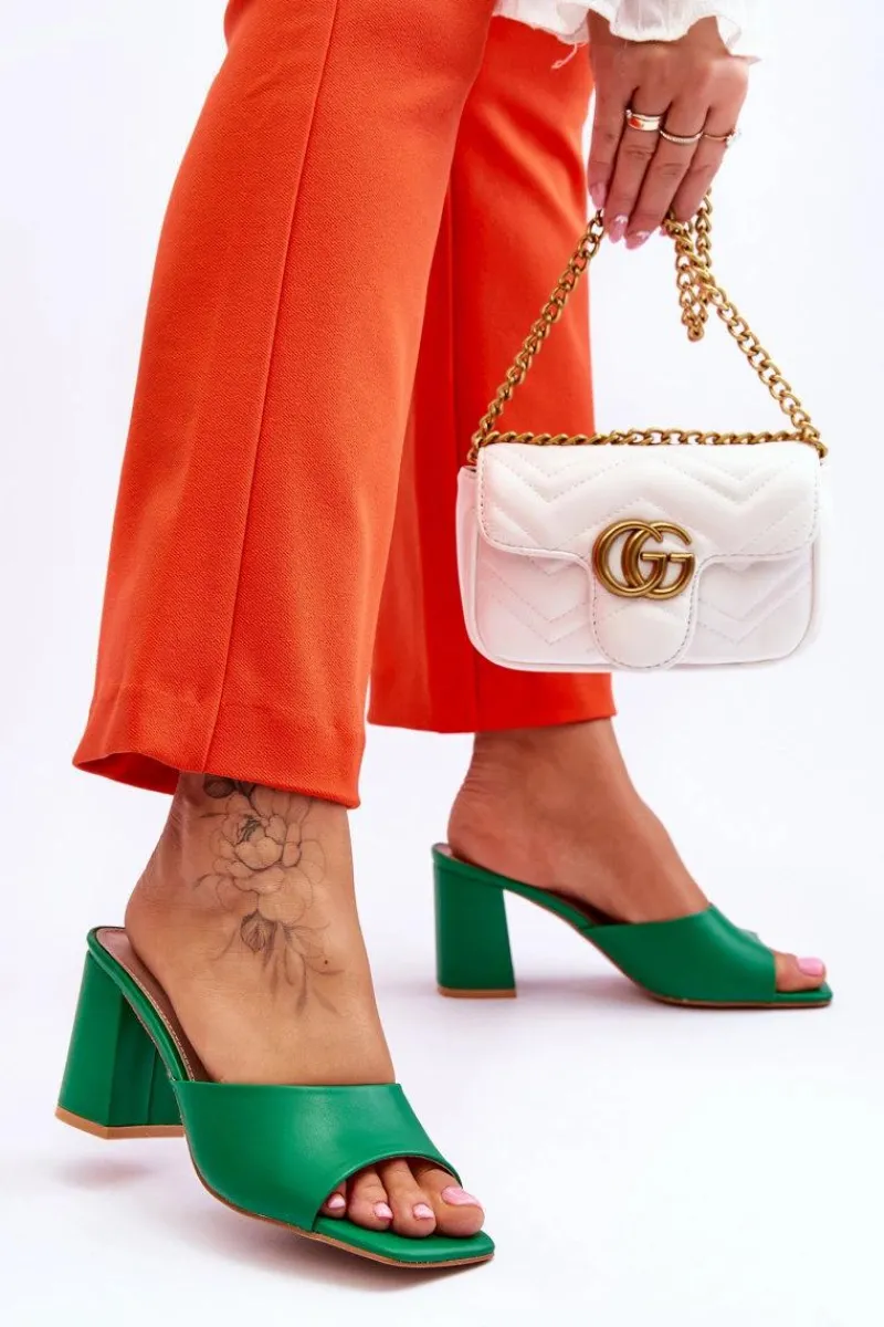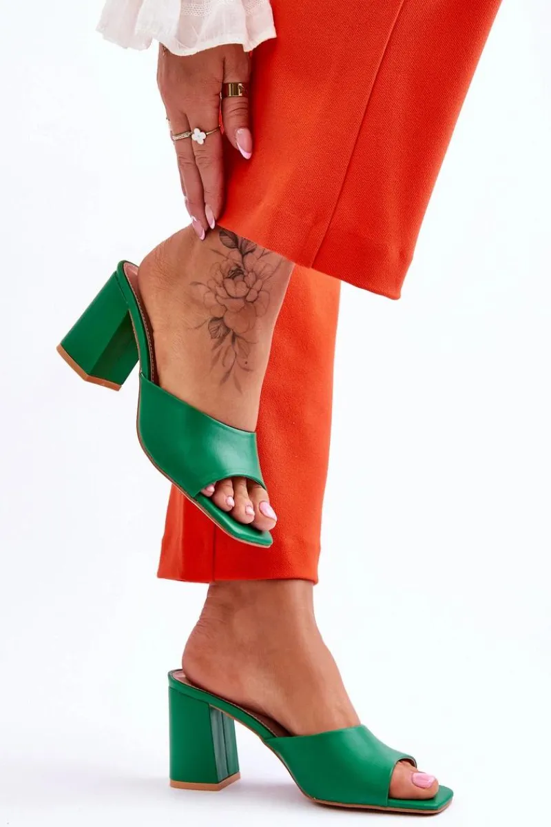 Damskie klapki o klasycznym fasonie. Model ten został wykonany z eko skóry. Klapki posiadają otwarty, kwadratowy nosek. Wkładka jest wygodna i wykonana z eko skóry. Klapki osadzono na obcasie w postaci słupka. Idealne do wielu stylizacji w upalne dni! Przy wyborze rozmiaru prosimy sugerować się tabelą rozmiarów.
