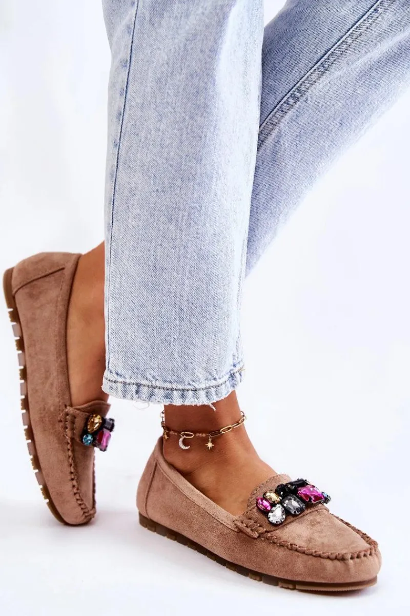 Damskie mokasyny zostały wykonane z miłego w dotyku eko zamszu. Na przodzie znajdują się ozdobne kamienie. Mokasyny zostały osadzone na delikatnej platformie, z antypoślizgową podeszwą. Zapiętek jest delikatnie usztywniany. Miękka wkładka jest dodatkowo perforowana i wykonana z naturalnej skóry. Świetny model do wielu stylizacji! Przy wyborze rozmiaru prosimy sugerować się tabelą rozmiarów.