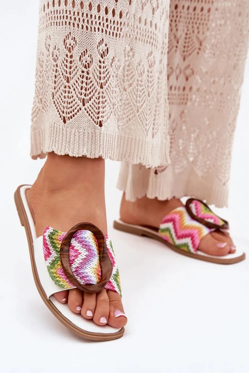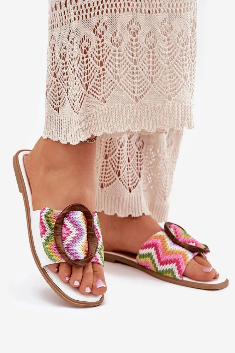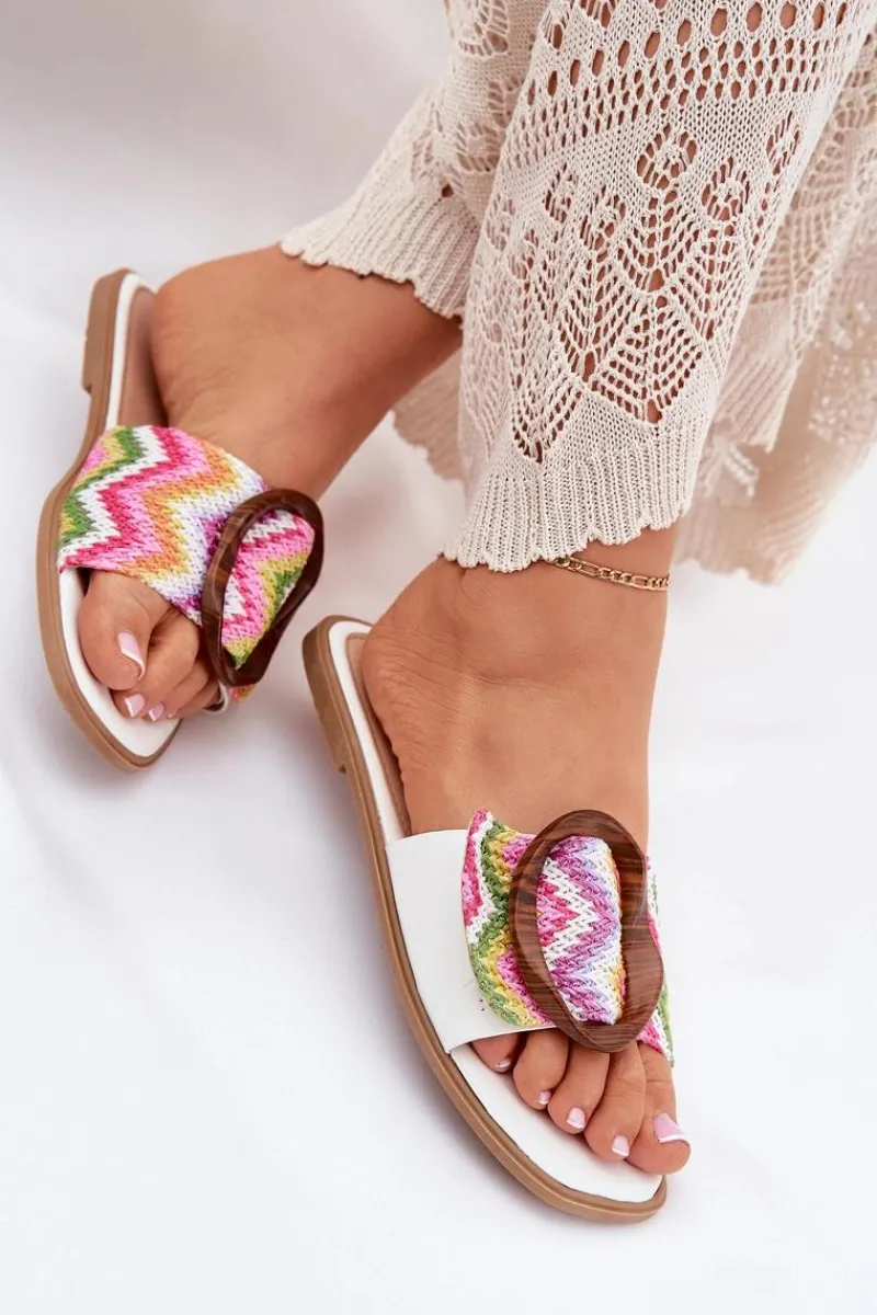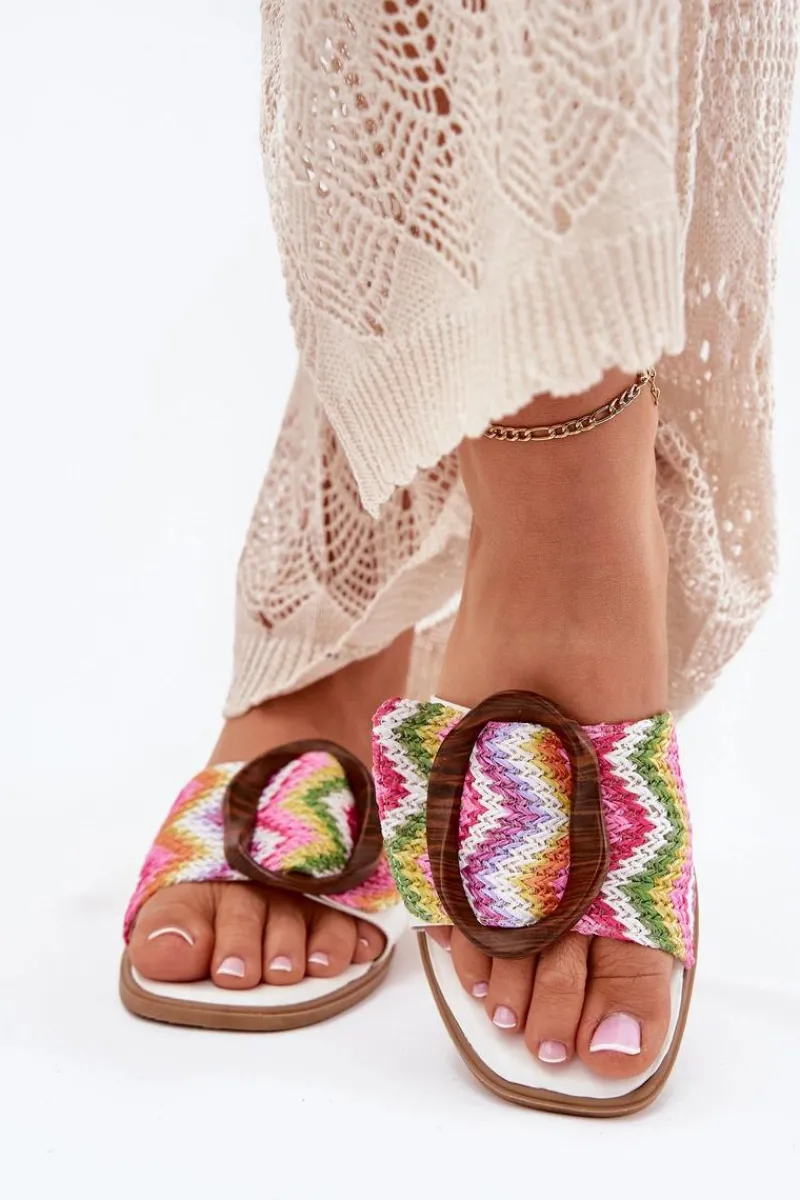 Klapki damskie z eko skóry na płaskim obcasie to stylowa i wygodna opcja na co dzień. Model ten wyróżnia się paskiem z plecionką, który nadaje im subtelnego uroku, oraz ozdobną klamrą, która przyciąga wzrok. Idealne do letnich stylizacji! Przy wyborze rozmiaru prosimy sugerować się tabelą rozmiarów.