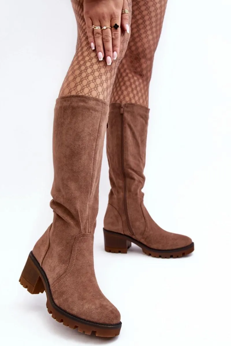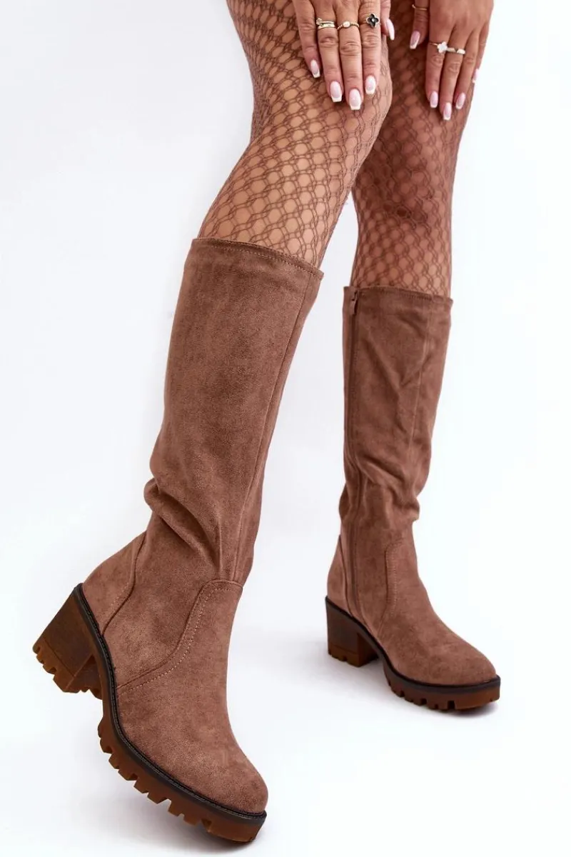 Kozaki damskie z cholewką przed kolano. Wykonane z eko zamszu. Zapinane na suwak. Osadzone na niskim, masywnym obcasie. Zapiętek usztywniany. Noski zaokrąglone Wykorzystasz je w wielu stylizacjach! Koniecznie muszą być Twoje! Przy wyborze rozmiaru prosimy sugerować się tabelą rozmiarów.