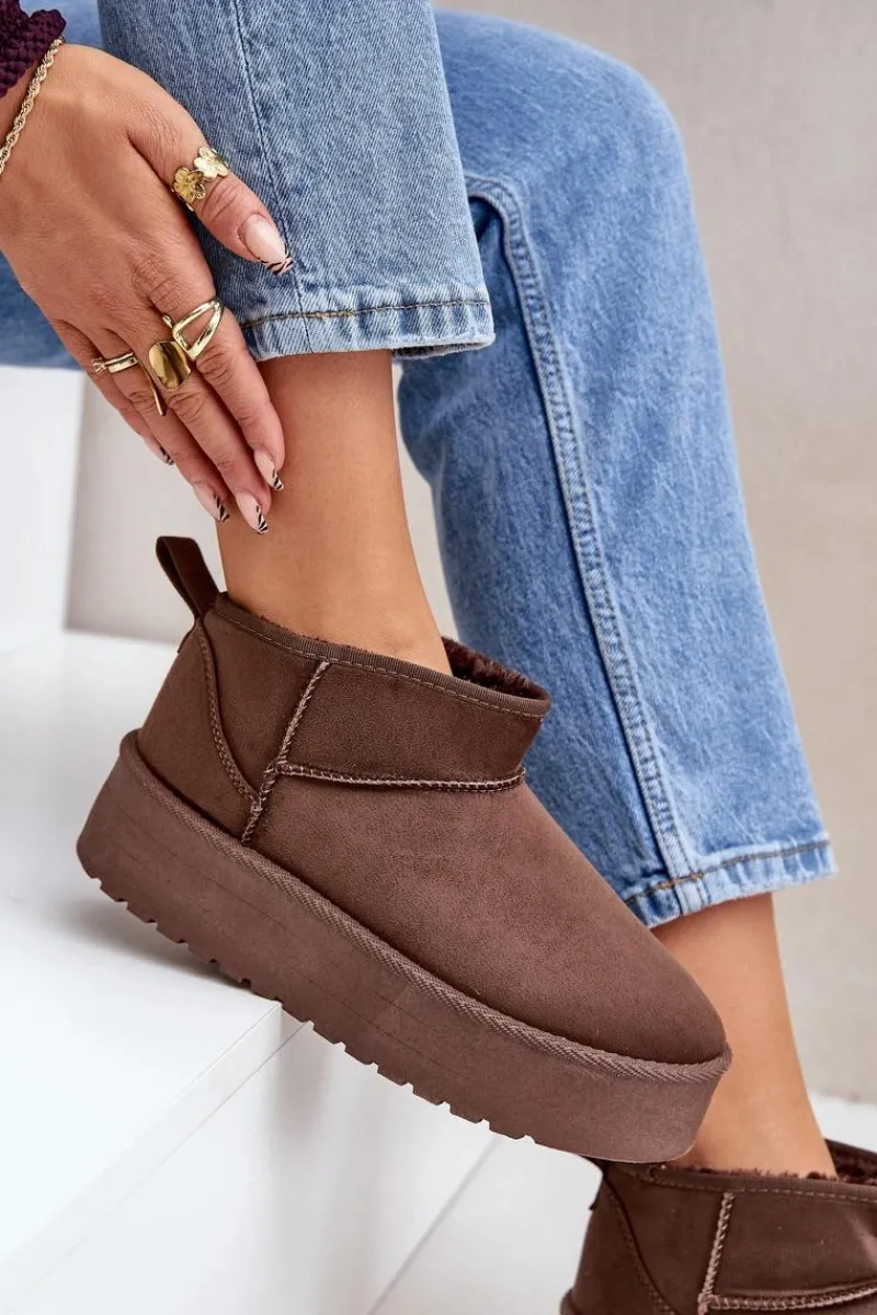 Klasyczne śniegowce idealnie sprawdzą się podczas chłodnych dni. Wykonane z eko zamszu. Osadzone na platformie, która doskonale odizoluje od zimnego podłoża. Wnętrze butów zostało ocieplone grubym futerkiem, co zapewni ciepło w mroźne dni. Ten klasyczny model dopasujesz do wielu stylizacji! Przy wyborze rozmiaru prosimy sugerować się tabelą rozmiarów.