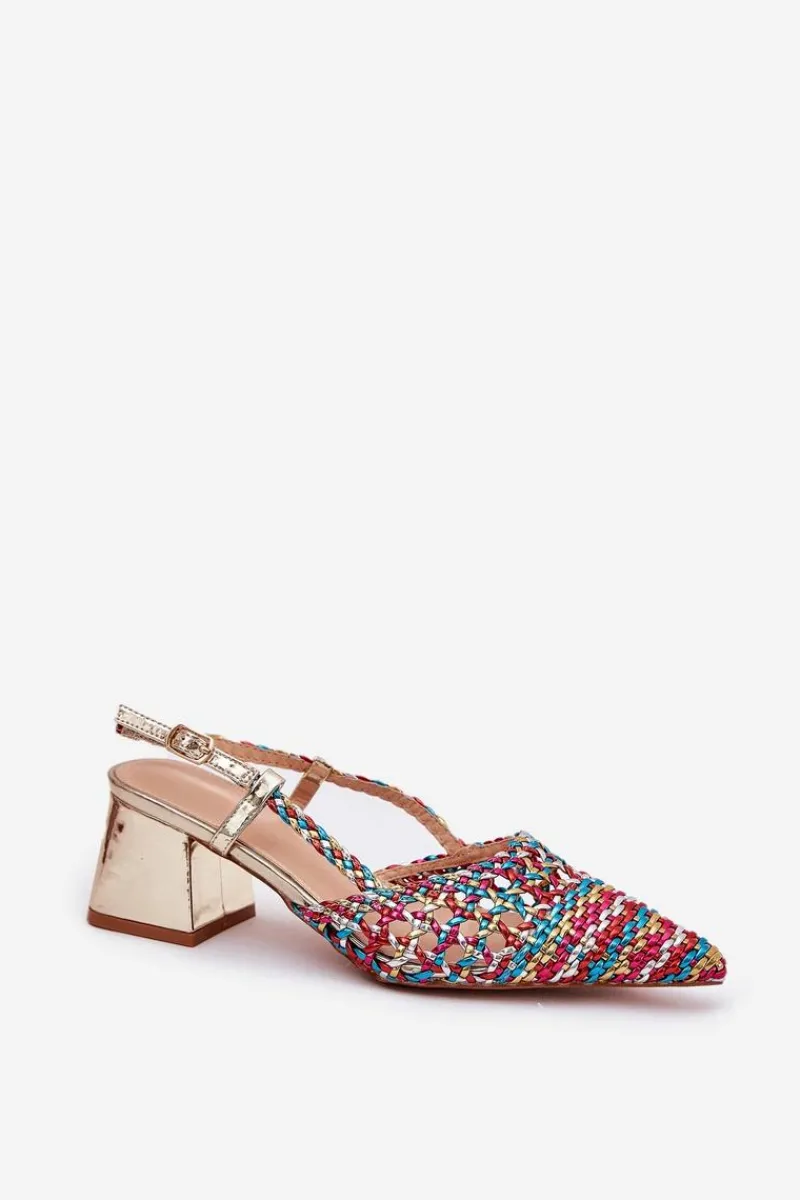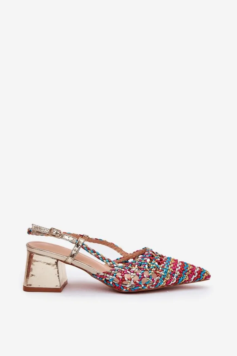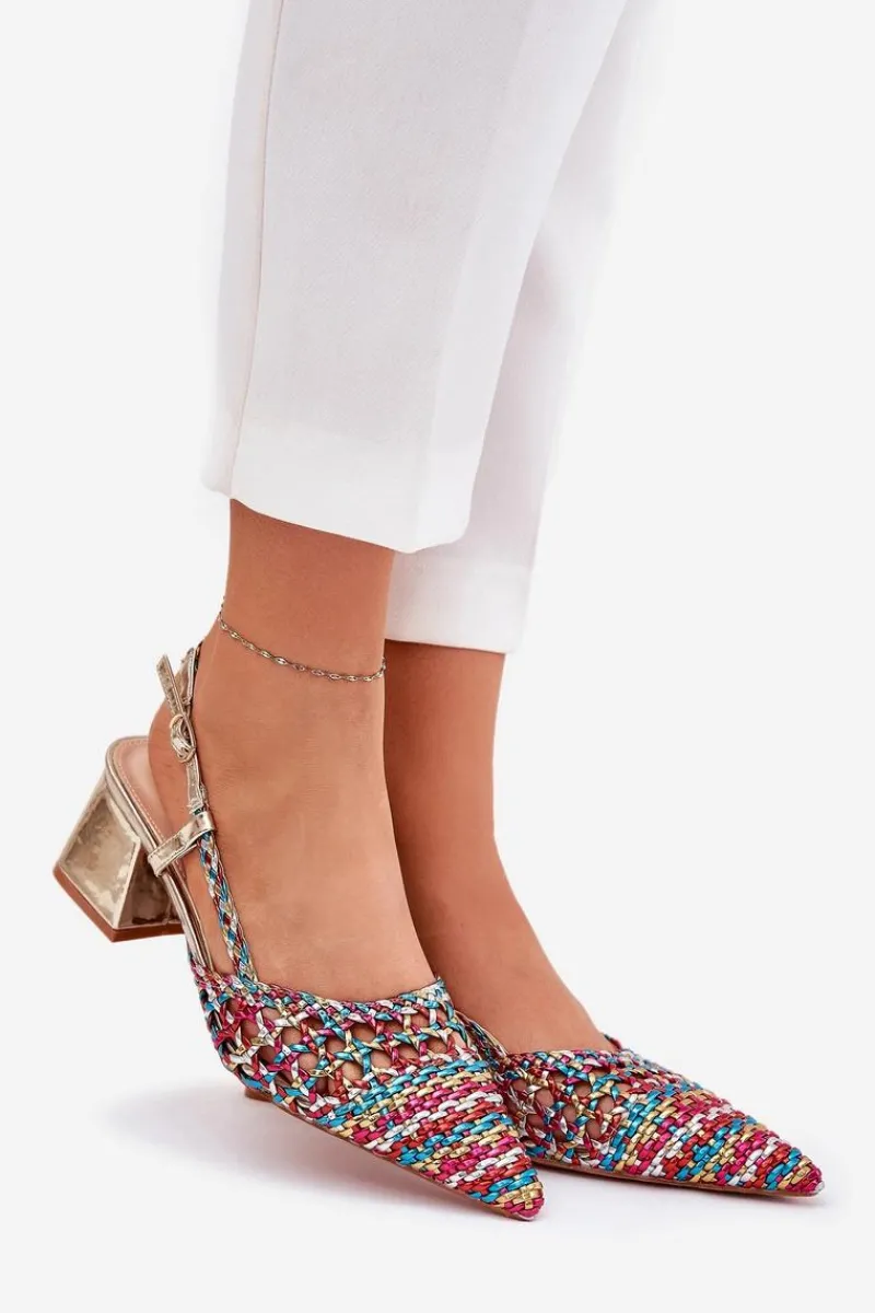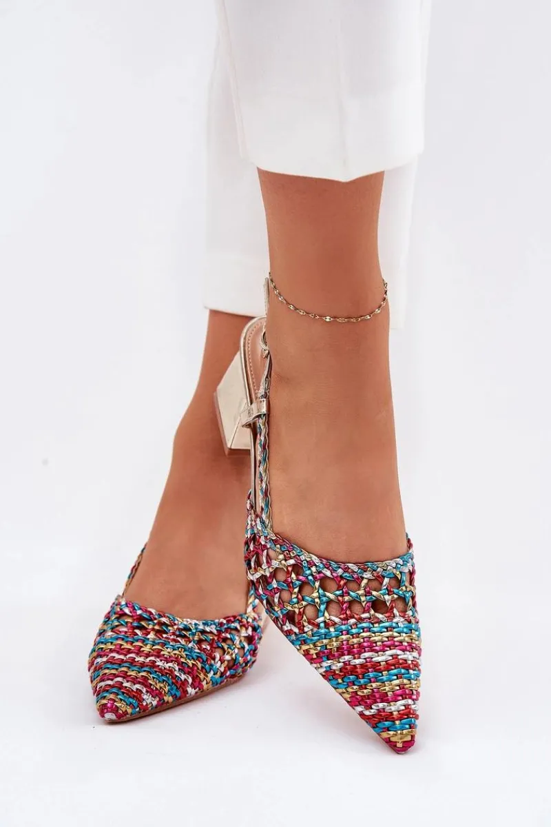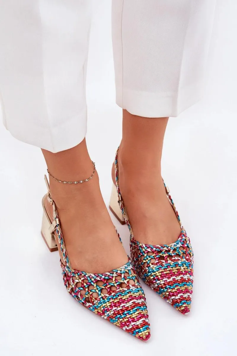 Sandały damskie z plecionki, osadzone na obcasie typu słupek. Szpiczaste noski nadają subtelnej elegancji, a zapinane na sprzączkę pozwalają na idealne dopasowanie do stopy. Miękka wkładka z eko skóry zapewnia komfort przez cały dzień. Te sandały będą doskonałym wyborem na letnie dni, świetnie komponując się z sukienkami, spódnicami czy spodniami, dodając każdej stylizacji wyjątkowego charakteru. Przy wyborze rozmiaru prosimy sugerować się tabelą rozmiarów.
