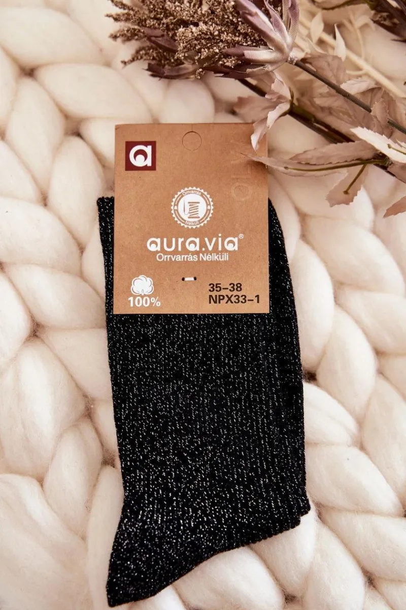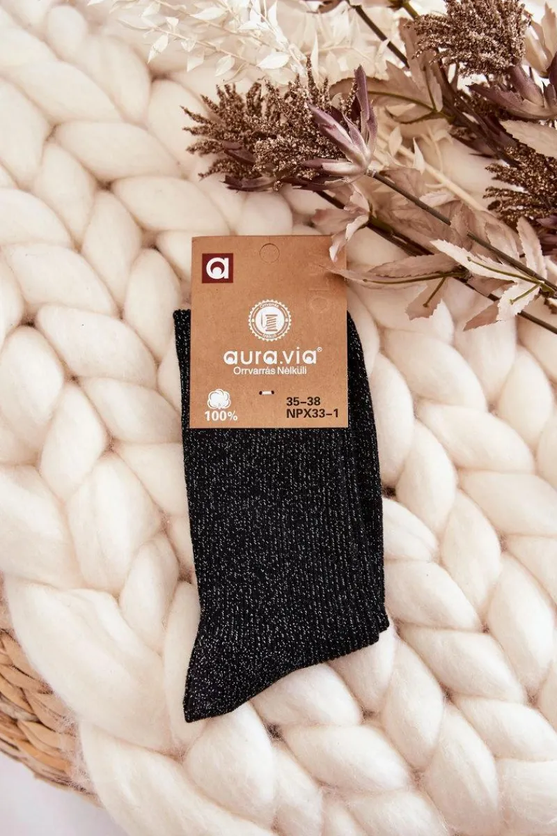 Modne skarpetki damskie zostały wykonane z bawełnianej tkaniny z dodatkiem lurexu, czyli nici metalizowanej. Skarpetki te są bezuciskowe. Model delikatnie prążkowany, za kostkę. Skarpetki te świetnie sprawdzą się jako dodatek do codziennych stylizacji z półbutami typu loafery. Ten model koniecznie powinien znaleźć się w Twojej szafie!