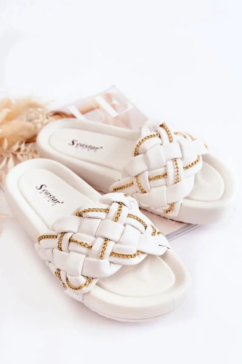 Modne klapki wykonane z eko skóry. Posiadają pleciony pasek z ozdobnym, delikatnym łańcuszkiem. Osadzone na platformie. Wkładka wykonana z gumowego tworzywa. Nosek odkryty, zaokrąglony. Model, który świetnie wpasuje się w letnie klimaty! Koniecznie powinnaś je mieć! Fason ten będzie pasować do wielu stylizacji. Model klasyczny, wsuwany. Przy wyborze rozmiaru prosimy sugerować się tabelą rozmiarów.