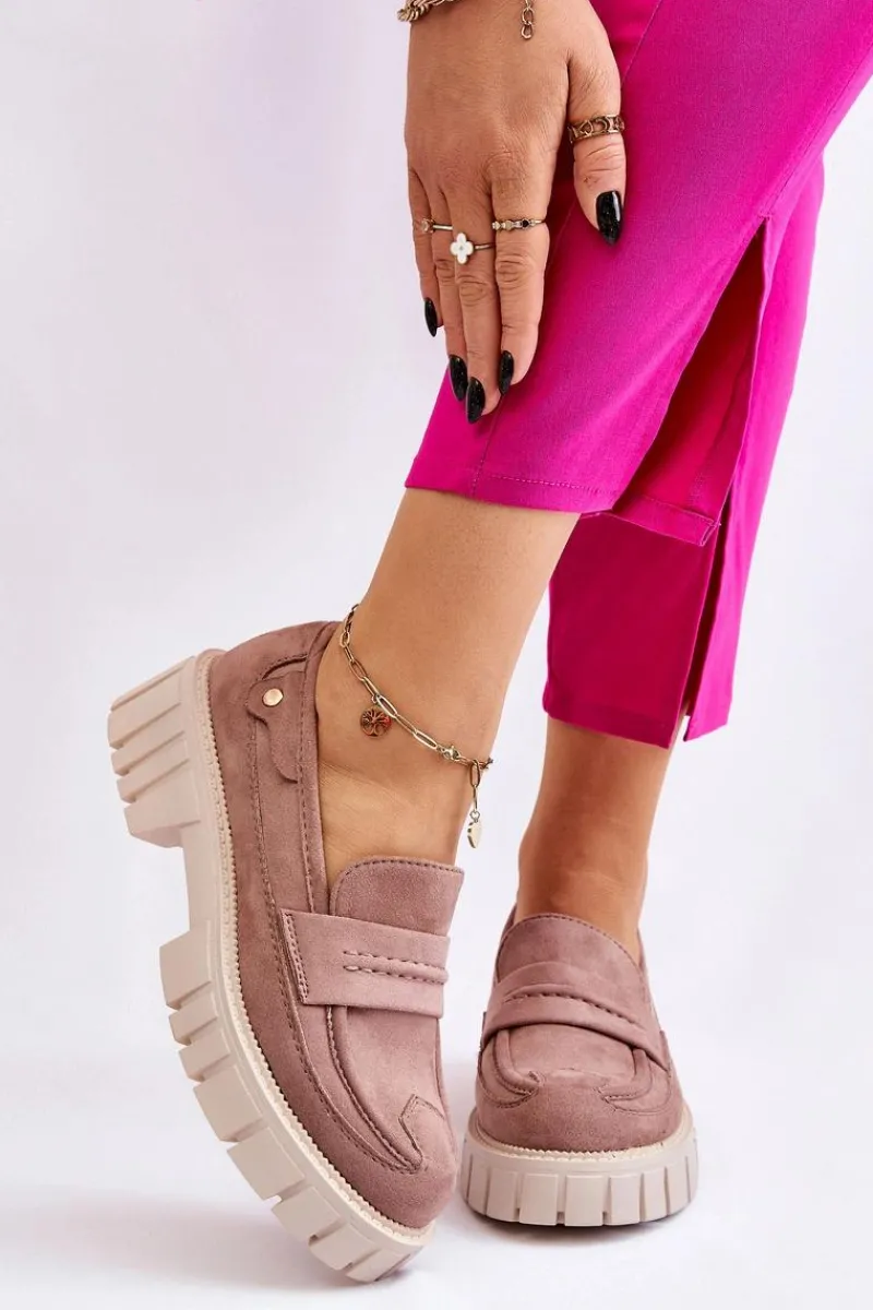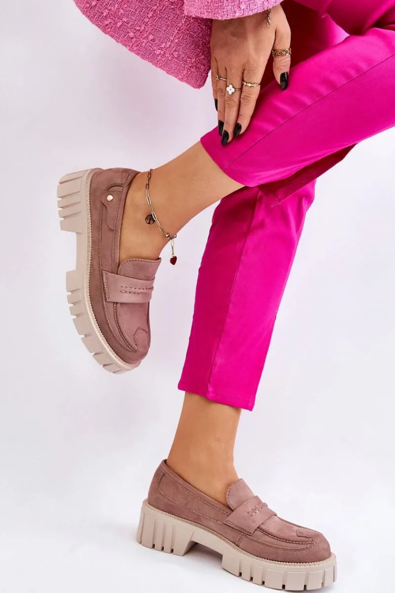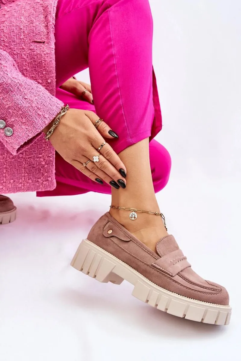 Świetne półbuty w stylu loaferów zostały wykonane z wysokiej jakości eko skóry z obszyciami. Charakterystyczne zdobienie w postaci paseczka na przodzie oraz nitu z boku cholewki. Posiadają masywną platformę oraz płaski obcas. Miękka wykonana z eko skóry wkładka zadba o komfort podczas użytkowania obuwia. Dodatkowo zapiętek jest usztywniany. Przy wyborze rozmiaru prosimy sugerować się tabelą rozmiarów.