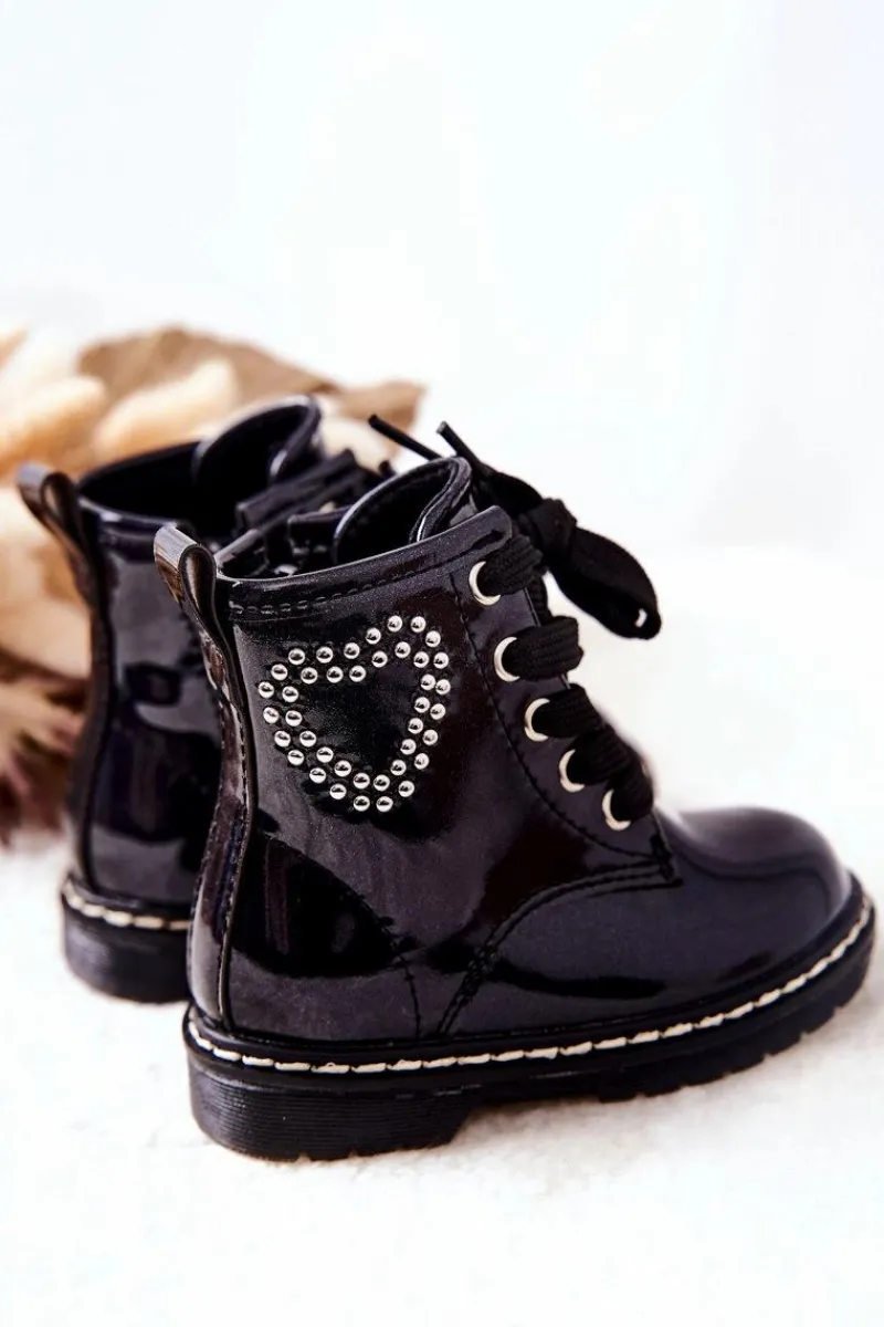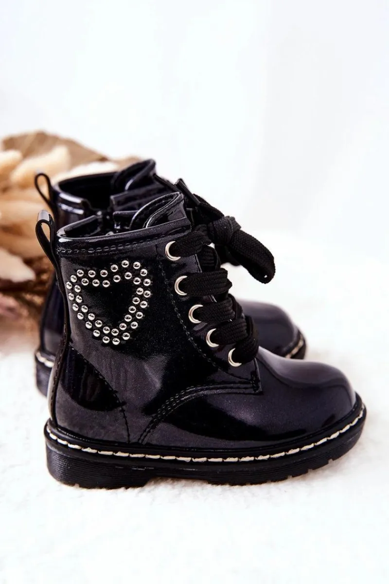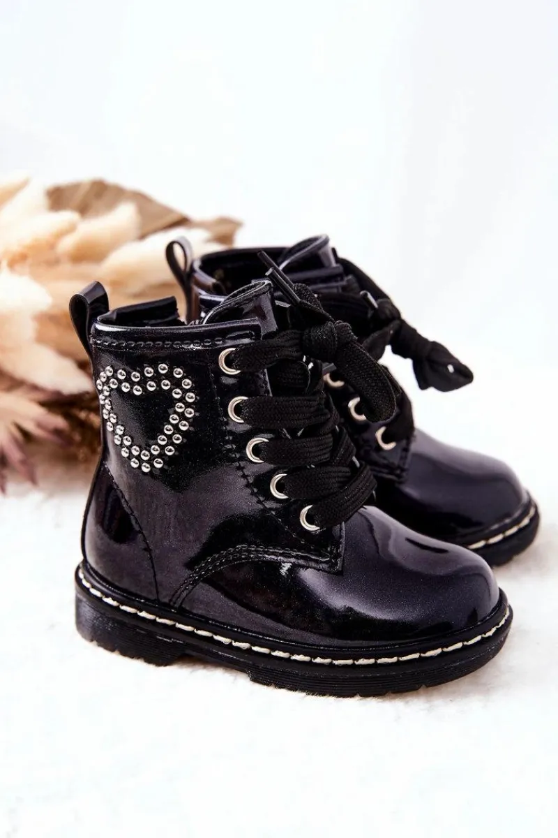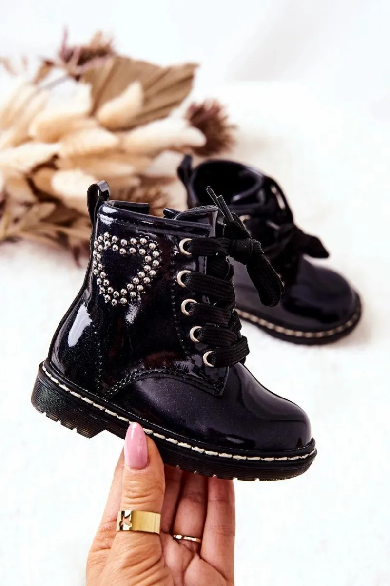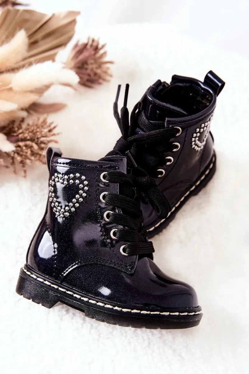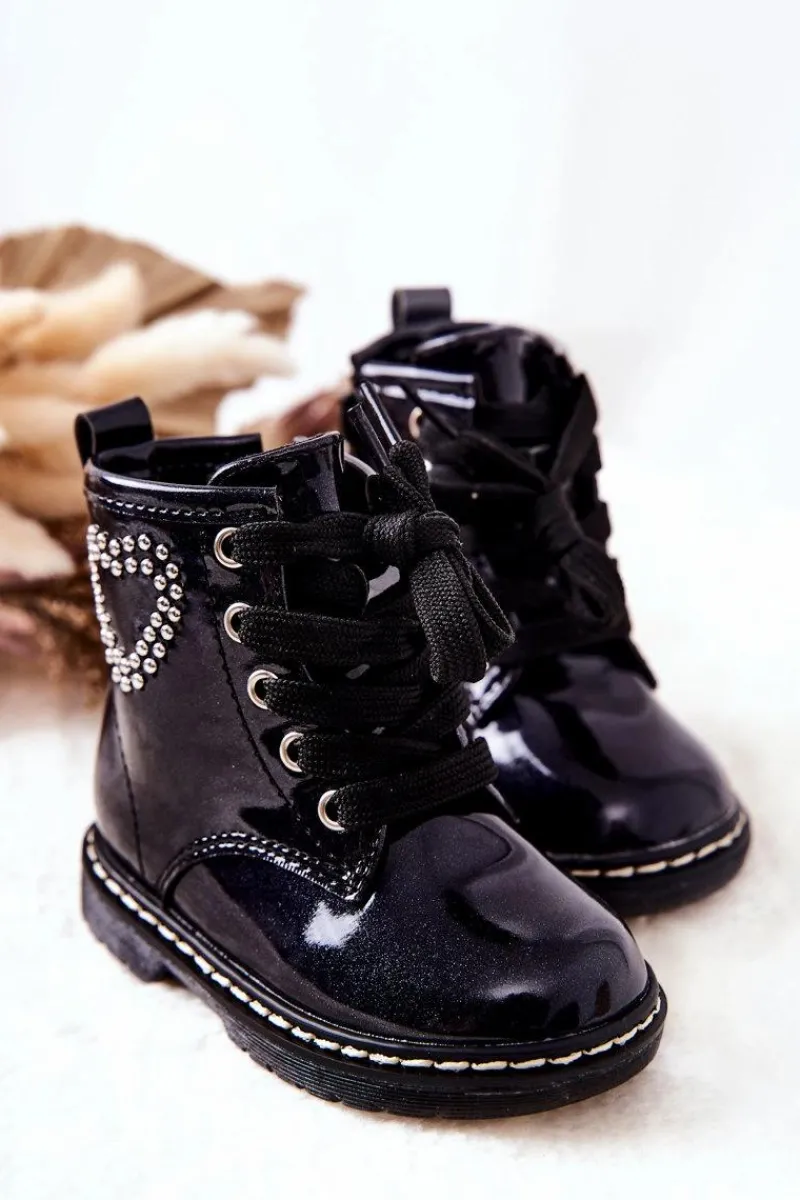 Cudowne botki z błyszczącym efektem i serduszkiem z ćwieków zachwyci niejedną miłośniczkę mody! Dopasowanie do stopy zapewni wygodne i klasyczne sznurowanie, a zakładanie ułatwi wszyty na boku suwak. Wykonane z lakierowanej eko skóry. Koniecznie sprawdź całą naszą ofertę dziecięcych botków. Przy wyborze rozmiaru prosimy kierować tabelą rozmiarów.