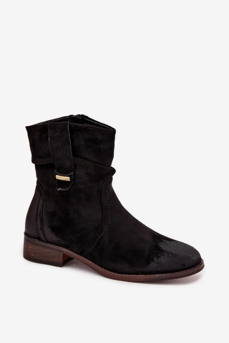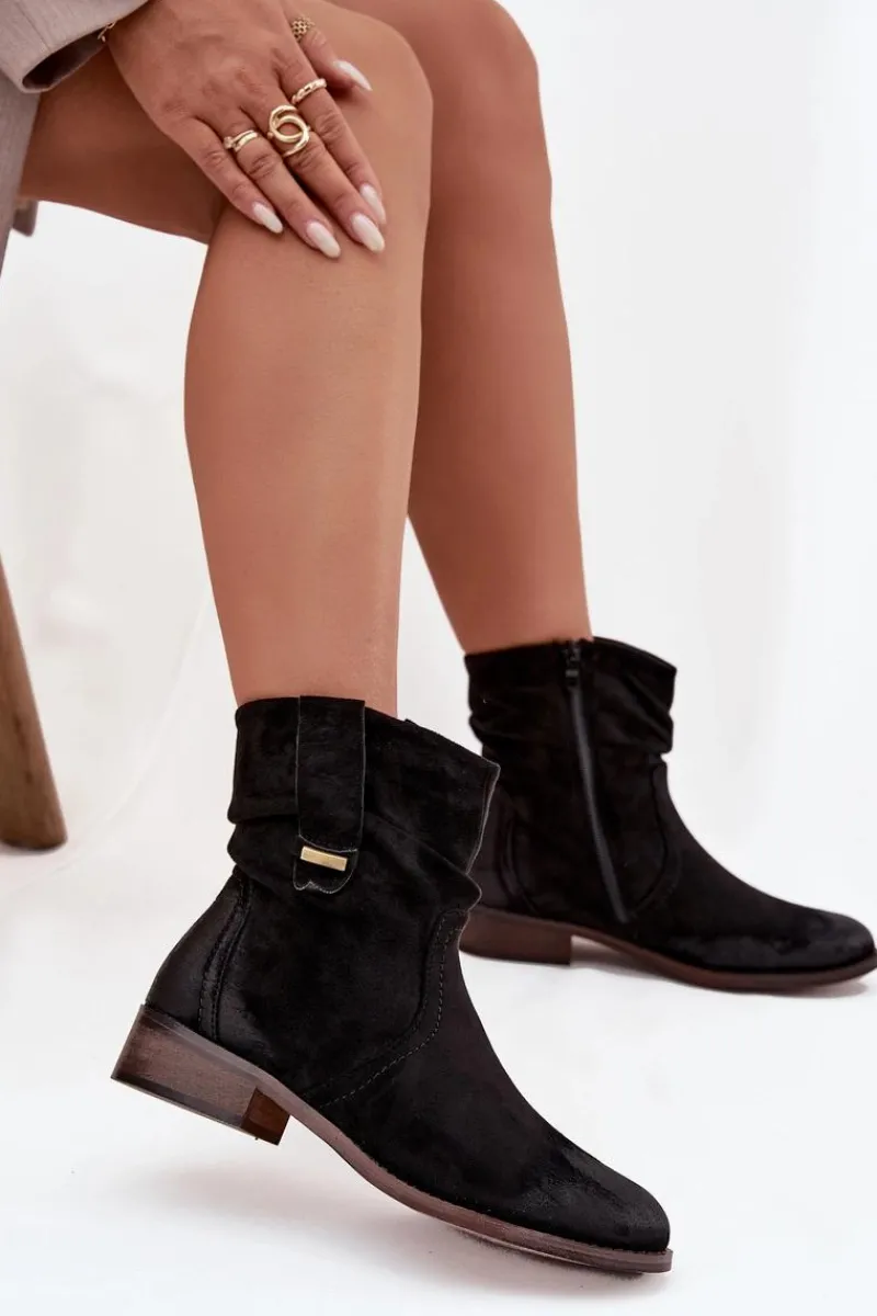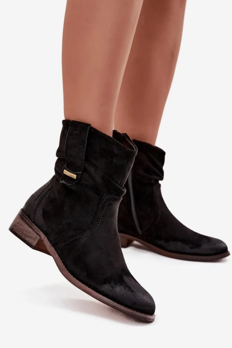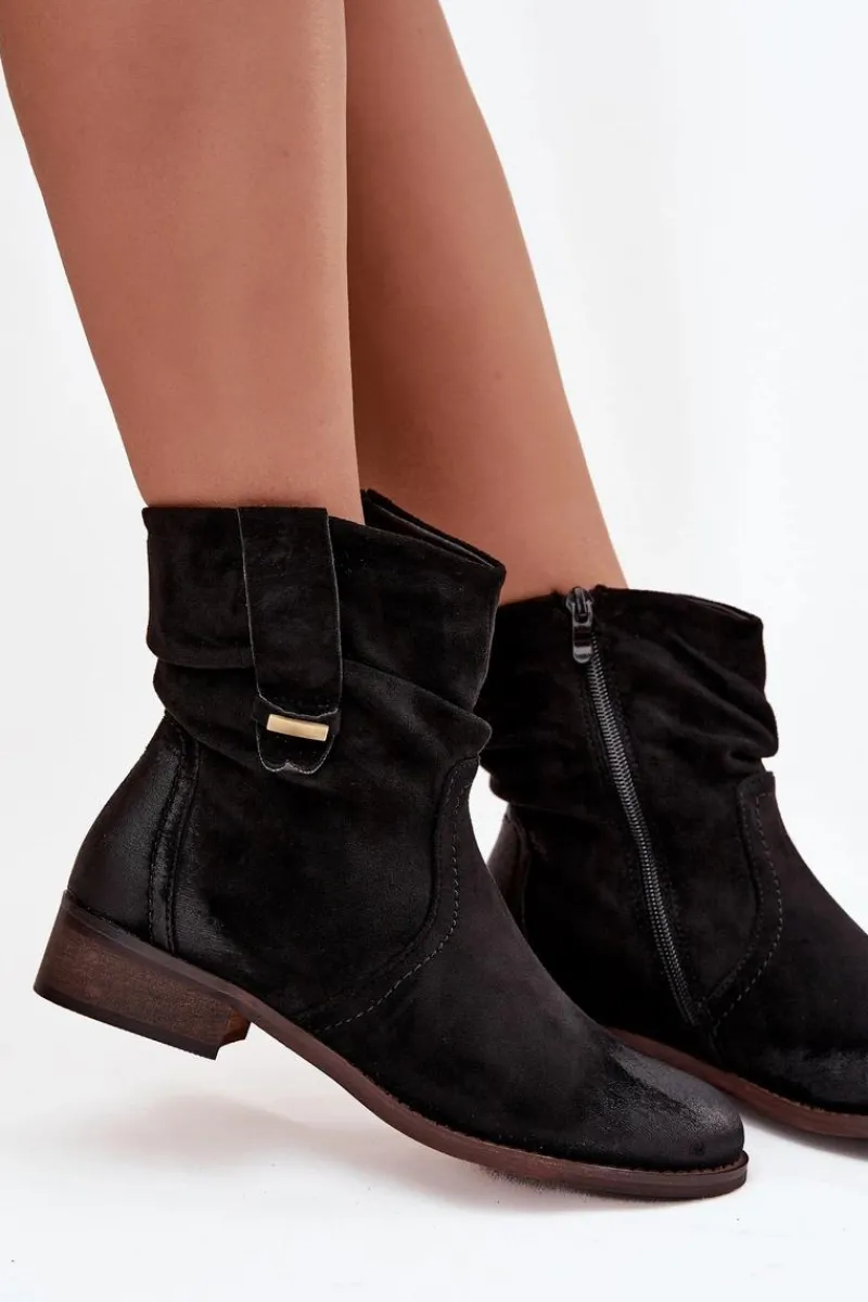 Botki damskie wykonane z miękkiego eko zamszu. Model osadzony na niskim obcasie zapewnia komfort noszenia, a ocieplane wnętrze doskonale sprawdza się w chłodniejsze dni. Zamek ułatwia zakładanie i zdejmowanie butów, natomiast zaokrąglone noski nadają im klasycznego charakteru. Uroku dodaje marszczona cholewka, która podkreśla stylowy, kobiecy wygląd. To uniwersalne botki idealne do codziennych stylizacji – świetnie pasują zarówno do spodni, jak i sukienek.Przy wyborze rozmiaru prosimy sugerować się tabelą rozmiarów.