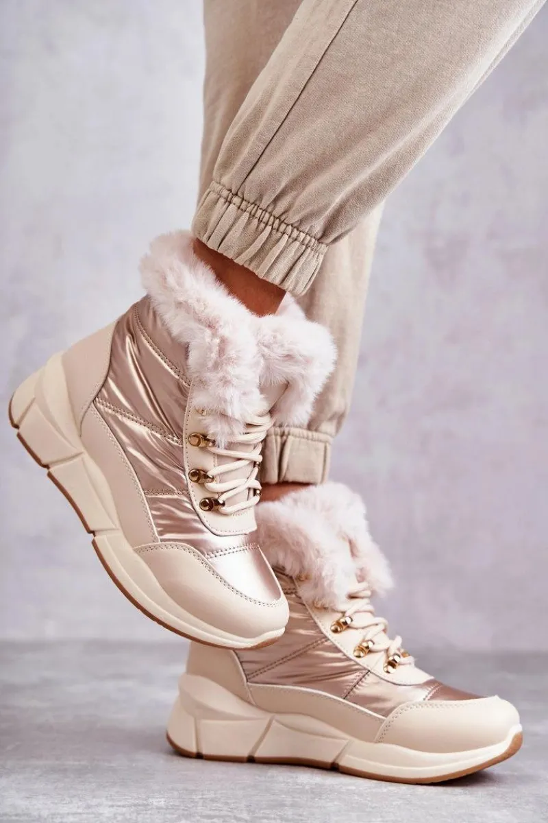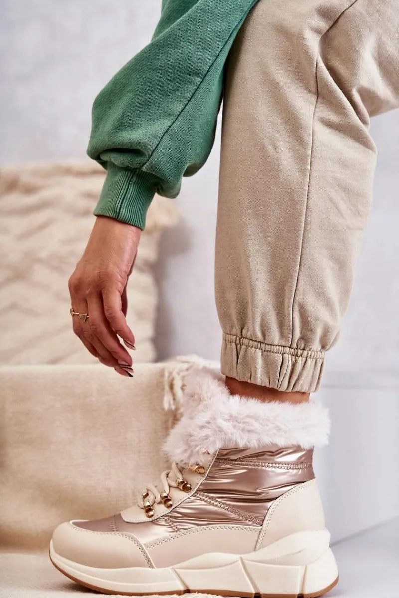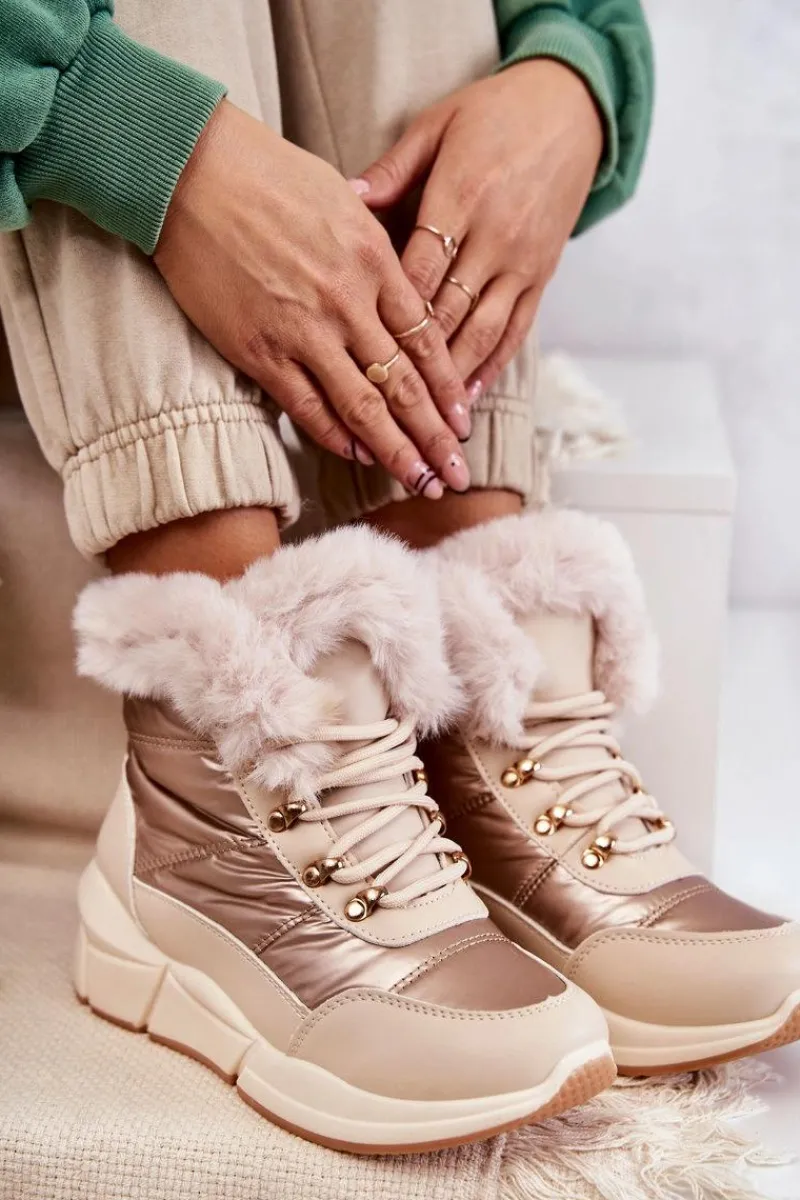 Modne śniegowce zostały wykonane z materiału odpornego na zimno i wiatr. Cholewka zakończona sztucznym futerkiem. Model klasycznie sznurowany. Śniegowce zostały osadzone na masywnej platformie. Posiadają w środku ocieplenie w postaci grubego futerka. Niezwykle ciepłe, a zarazem stylowe. Powinnaś je mieć! Idealnie uzupełnią każdą zimową stylizację! Przy wyborze rozmiaru prosimy sugerować się tabelą rozmiarów.