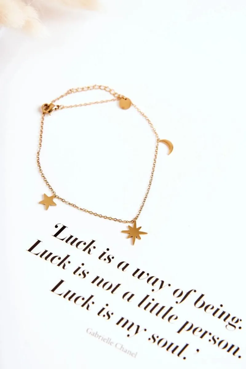 Bransoletki gwiazd 2014. Piękna bransoletka na nogę na cienkim łańcuszku wykonana ze stali nierdzewnej. Posiada możliwość regulacji długości. Na całej długości bransoletki znajdują się ozdobne elementy w postaci gwiazd i księżyca. Taki rodzaj biżuterii jest świetnym dodatkiem do stylizacji nie tylko tych codziennych, ale i tych bardziej eleganckich. Model ten posiada klasyczne zapięcie. Koniecznie sprawdź także pozostałe modele biżuterii dostępnej w naszej ofercie!