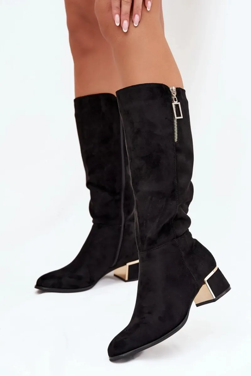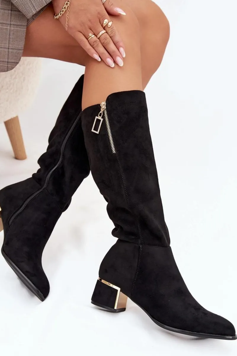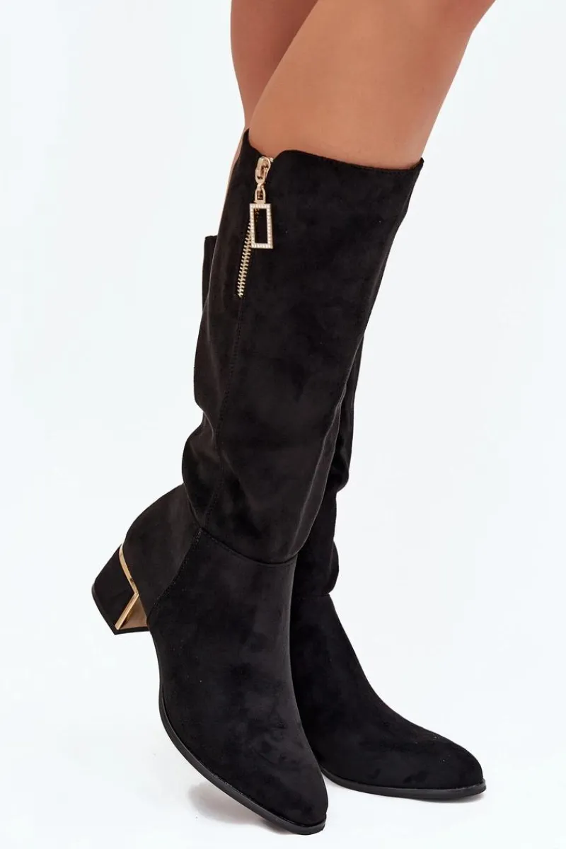 Kozaki damskie wykonane z eko zamszu to doskonała propozycja na chłodniejsze dni. Osadzone na niskim obcasie gwarantują wygodę podczas noszenia, a praktyczny zamek ułatwia zakładanie. Uwagę przyciągają stylowe detale – ozdobny suwak umieszczony na górze cholewki, obcas z lustrzanym elementem oraz przeszycia. To model, który świetnie sprawdzi się zarówno w codziennych, jak i bardziej eleganckich stylizacjach.
