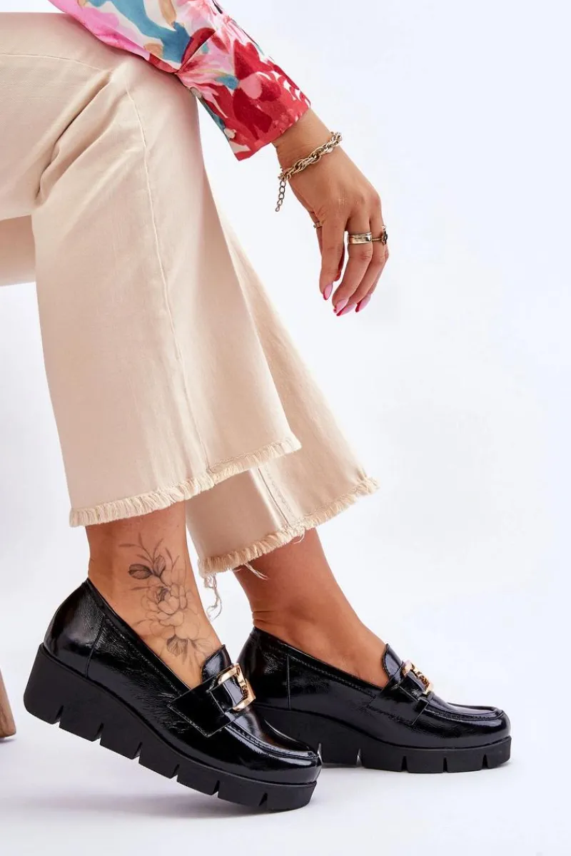Wygodne mokasyny damskie zostały wykonane z naturalnej skóry. Posiadają ozdobę na przodzie cholewki. Zapiętek w tych butach został usztywniony, co pozwoli na odpowiednią stabilizację stopy. Mokasyny są osadzone na koturnie oraz platformie. Świetny model do wielu stylizacji! Przy wyborze rozmiaru prosimy sugerować się tabelą rozmiarów.