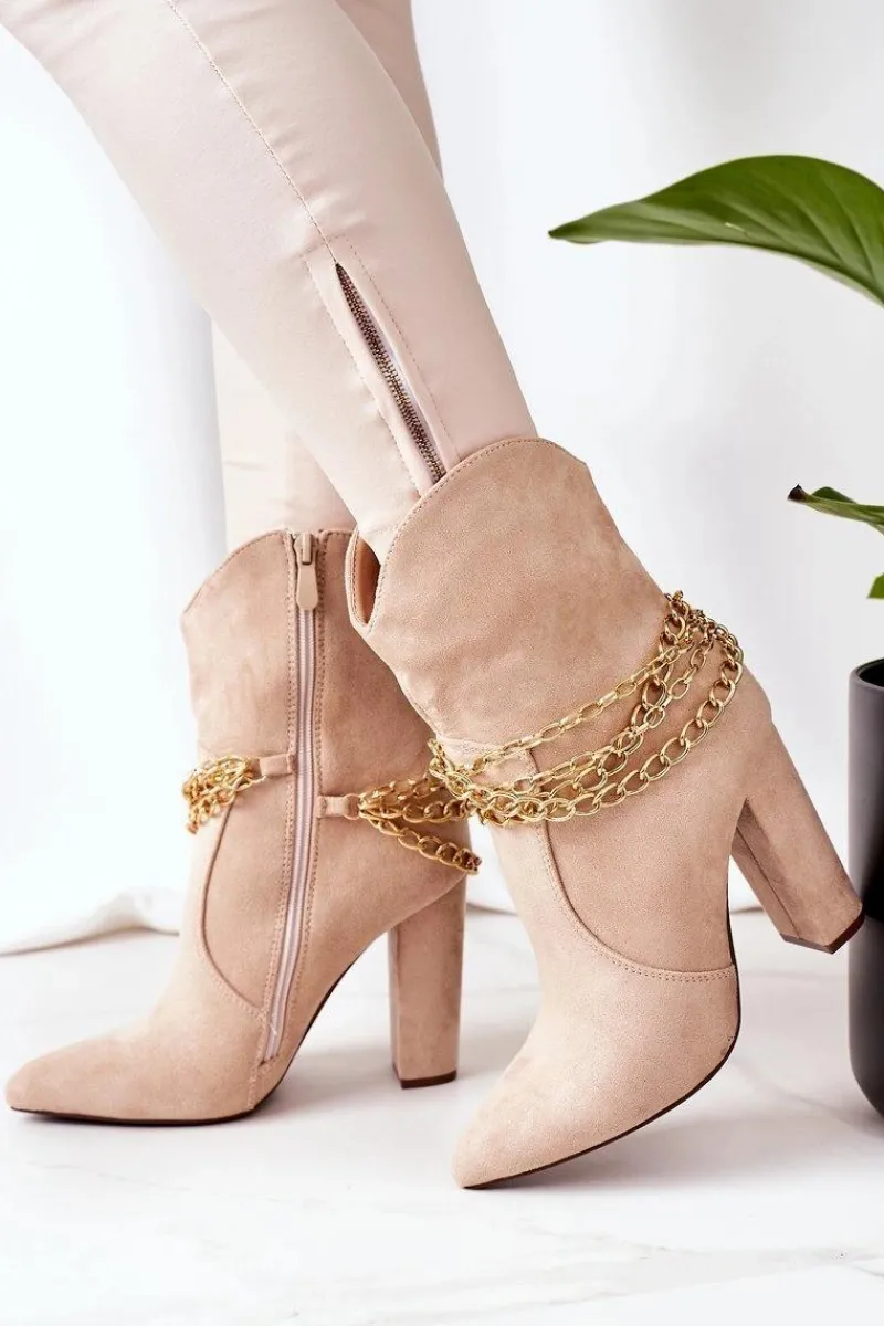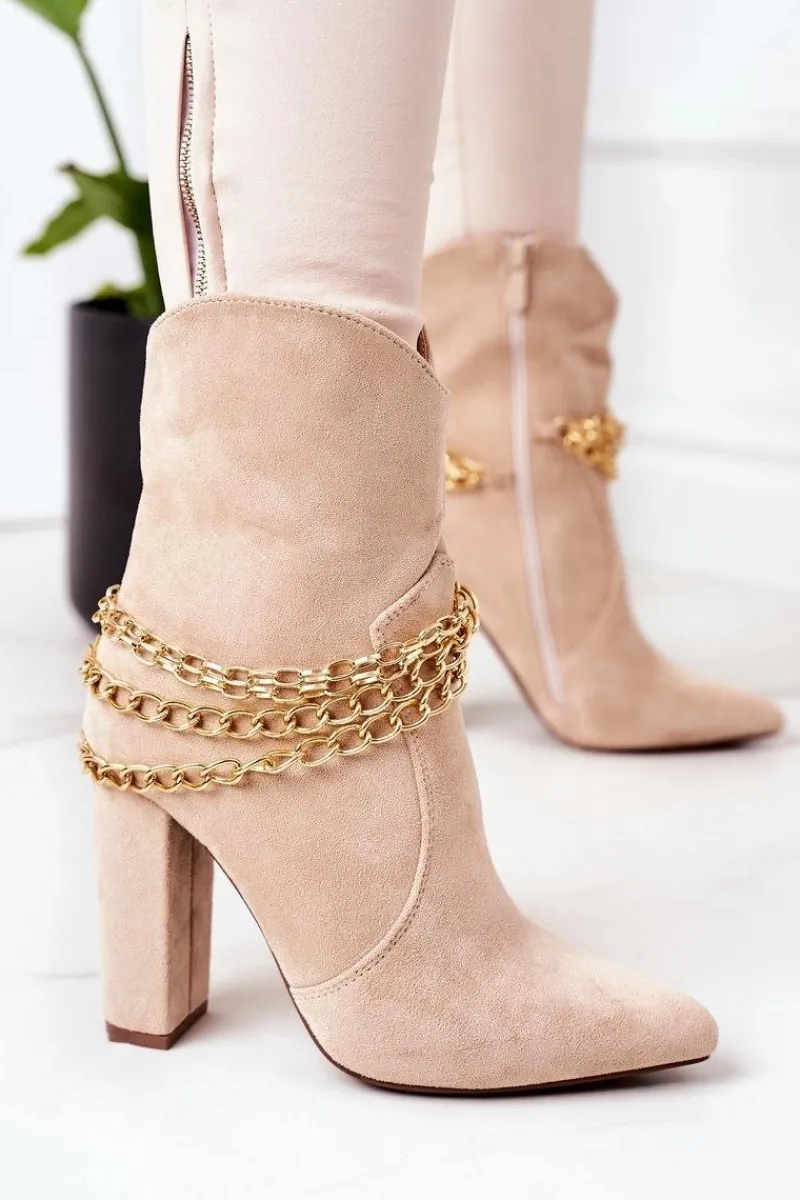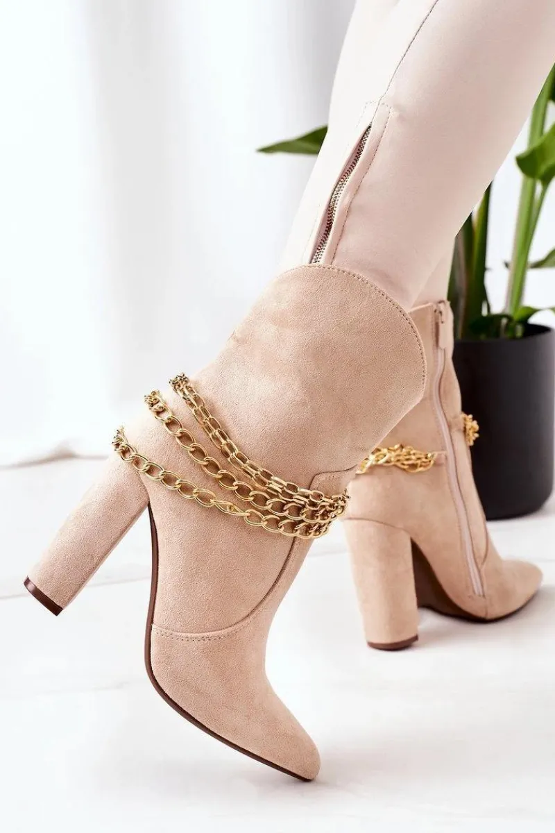 Wygodne i stylowe botki na słupku. Wnętrze butów ocieplone jest miłym w dotyku kocem obuwniczym. Botki wykonane są z eko zamszu.Przy wyborze rozmiaru prosimy sugerować się tabelą rozmiarów.