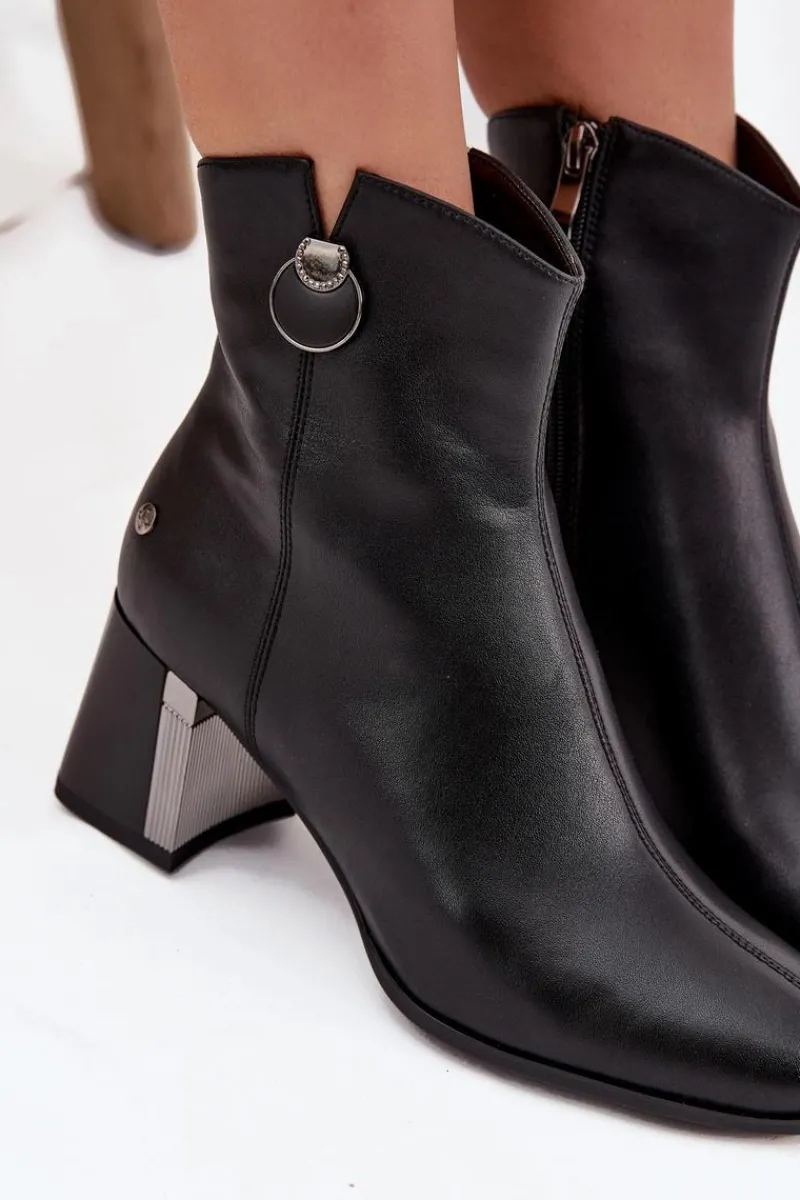 Eleganckie botki damskie marki Maciejka to propozycja dla kobiet ceniących klasykę w nowoczesnym wydaniu. Wykonane z wysokiej jakości naturalnej skóry, prezentują się szykownie i ponadczasowo. Model osadzony został na stabilnym obcasie typu słupek, który dodaje sylwetce smukłości, jednocześnie zapewniając wygodę podczas noszenia. Zaokrąglone noski. Praktyczne zapięcie na zamek ułatwia zakładanie. Wnętrze zostało ocieplone, dzięki czemu buty świetnie sprawdzą się w chłodniejsze dni. Subtelny, ozdobny detal umieszczony z boku cholewki dodaje całości uroku. To idealne botki na sezon jesienno-zimowy – eleganckie i stylowe. Przy wyborze rozmiaru prosimy sugerować się tabelą rozmiarów.