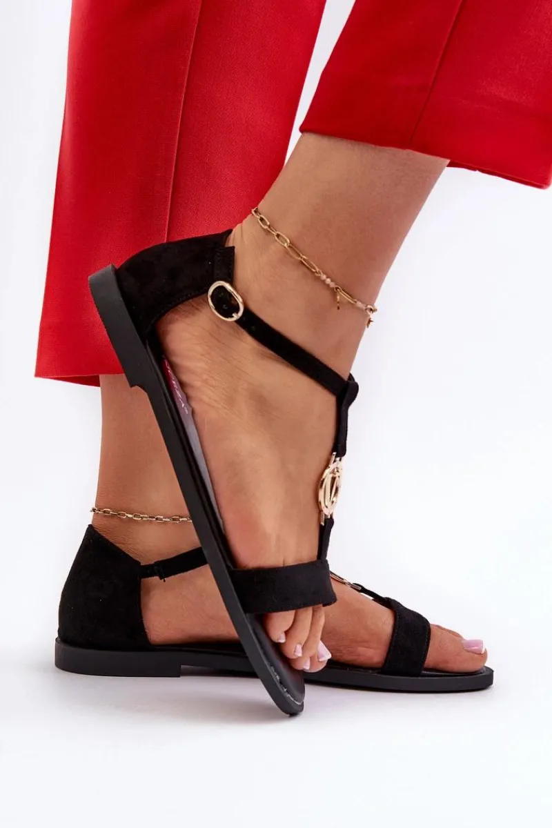 Damskie sandały od marki Vinceza. Wykonane z wysokiej jakości eko zamszu. Złota ozdoba dodaje im subtelnej elegancji. Zapinane na regulowany pasek ze sprzączką, gwarantują idealne dopasowanie do stopy. Zakryta pięta zapewnia stabilność i wygodę, idealną na długie spacery czy letnie wyjścia. Te sandały doskonale sprawdzą się w różnych stylizacjach! Przy wyborze rozmiaru prosimy kierować się tabelą rozmiarów.