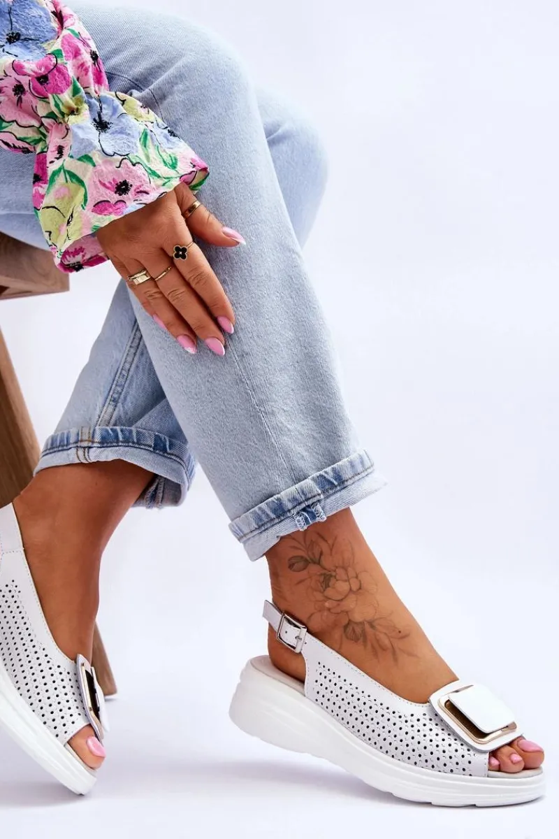 Sale Skórzane Ażurowe Sandały S.Barski BN291 Białe Damskie Sandały Ażurowe|Sandały Na Obcasie