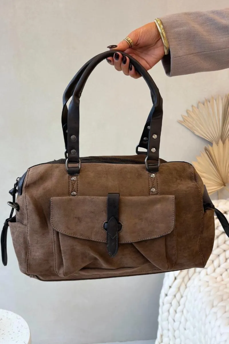 Torebka damska wykonana z miękkiego eko zamszu to praktyczny dodatek na co dzień. Model posiada wygodne uchwyty oraz odpinany, regulowany pasek, dzięki czemu można nosić ją zarówno w dłoni, jak i na ramieniu. Torebka jest zapinana na zamek, co zapewnia bezpieczeństwo przechowywanych rzeczy. Z przodu znajduje się praktyczna kieszonka, idealna na drobiazgi, do których chcesz mieć szybki dostęp. Wewnątrz umieszczono dwie kieszenie zapinane na zamek, które pomagają utrzymać porządek i organizację. To stylowy i funkcjonalny model, który doskonale sprawdzi się w codziennych stylizacjach – zarówno do pracy, jak i na spotkania czy zakupy.