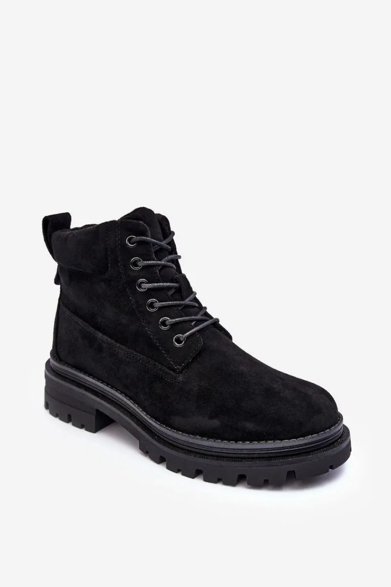Trapery damskie wykonane z eko zamszu. Osadzone na płaskim, stabilnym obcasie i platformie. Wewnątrz znajduje się ciepłe i miłe w dotyku futerko. Zapinane na suwak oraz dodatkowo posiadają sznurowanie. Zapiętek usztywniony. Buty idealnie sprawdzą się w zimowe dni! Przy wyborze rozmiaru prosimy sugerować się tabelą rozmiarów.
