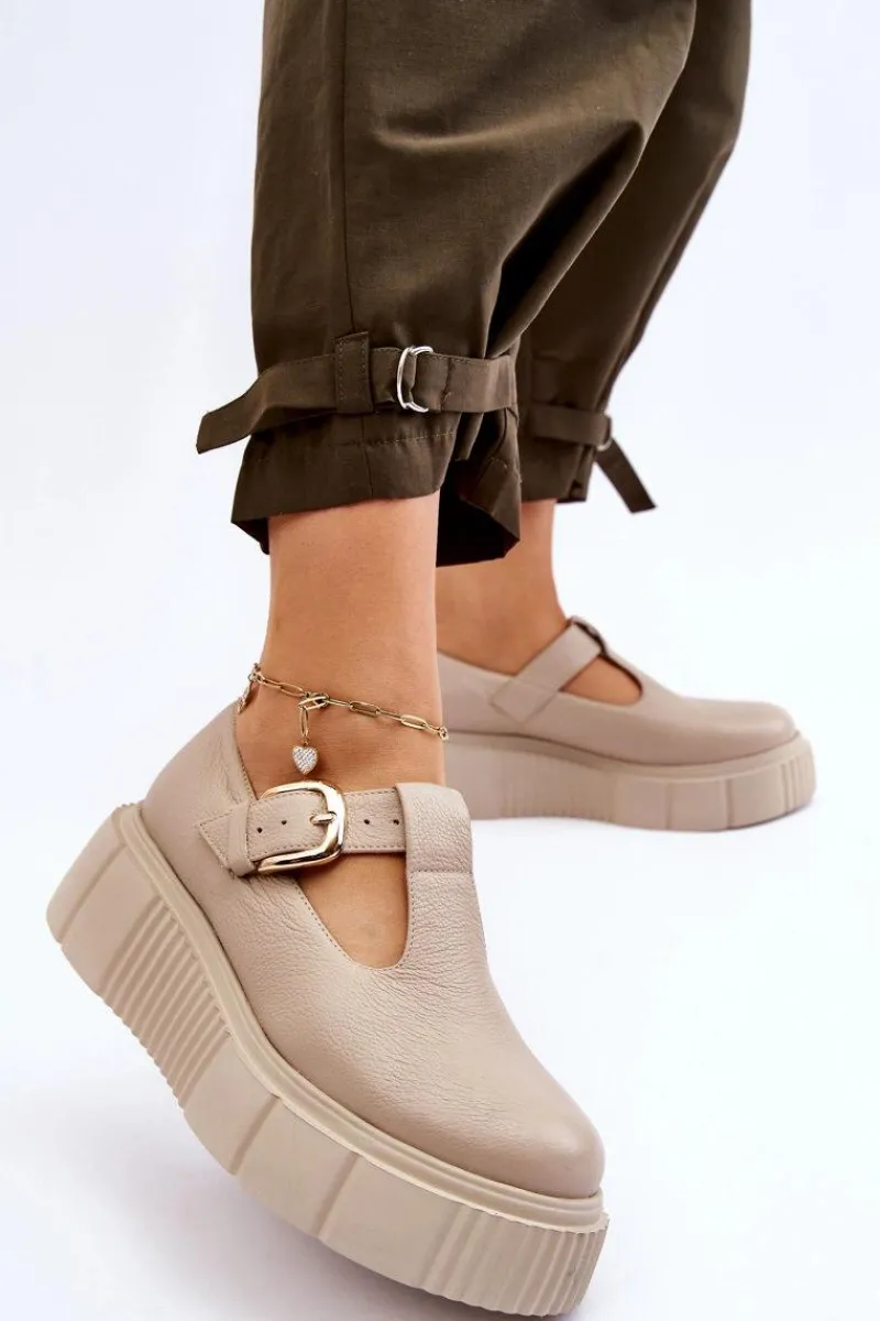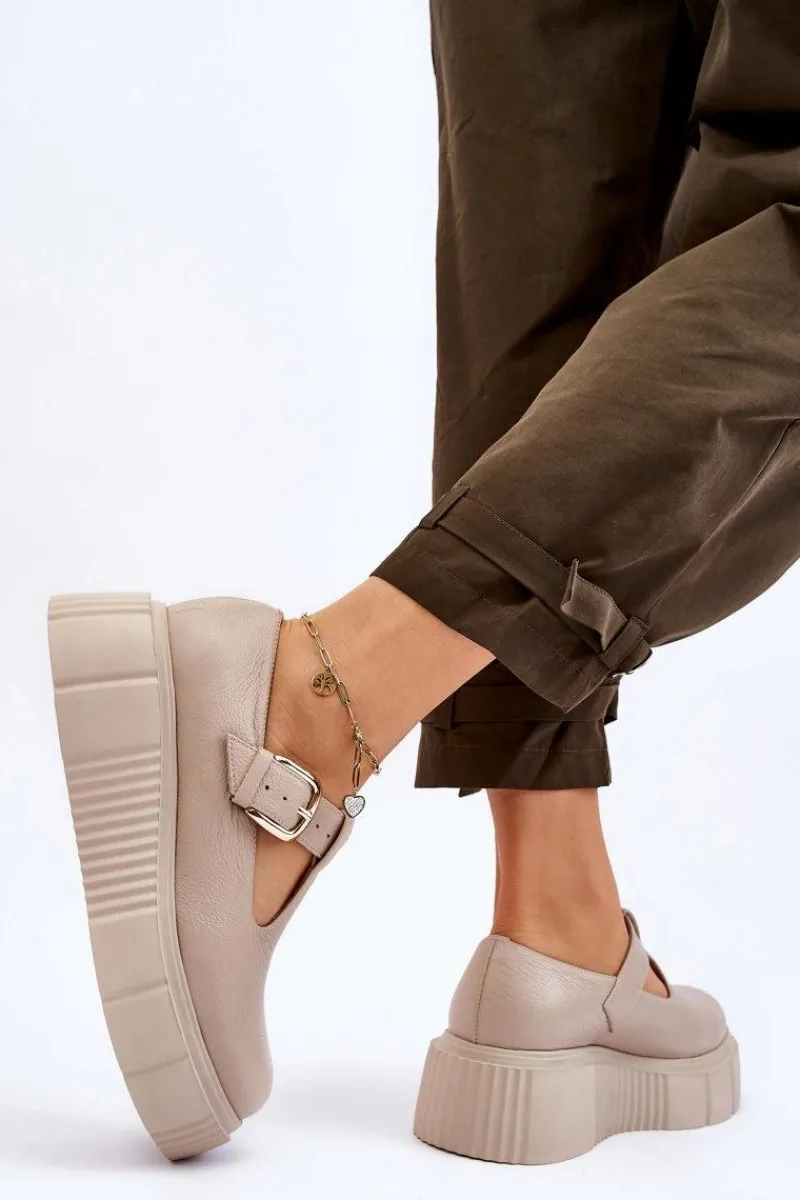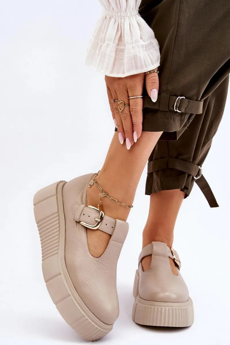 Modne półbuty damskie posiadają masywną platformę ze żłobieniami po bokach. Cholewka przed kostkę została wykonana z naturalnej skóry. Półbuty te posiadają usztywniany zapiętek. Zapinane z boku cholewki na klamrę z regulowanym paskiem. Ten model świetnie podkreśli Twoje stylizacje! Musisz go mieć! Przy wyborze rozmiaru prosimy sugerować się tabelą rozmiarów.