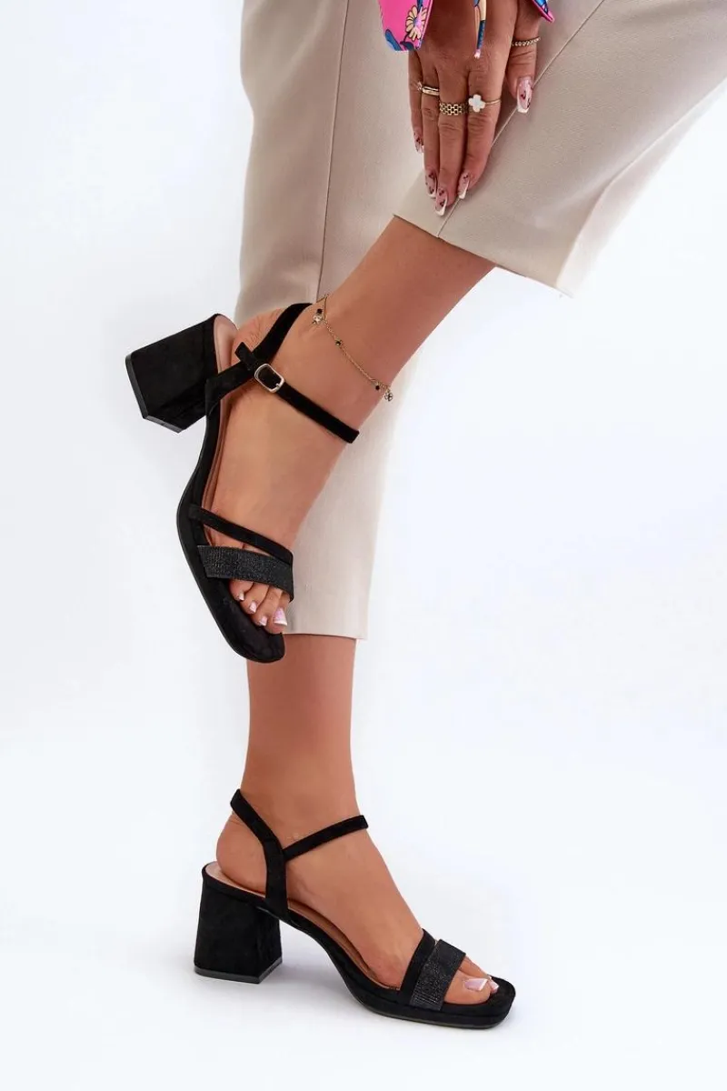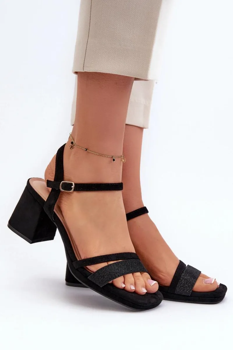 Sandały damskie wykonane z eko skóry. Osadzone na obcasie w postaci słupka. Zapinane na regulowany pasek ze sprzączką, gwarantują idealne dopasowanie do stopy. Z przodu dwa paseczki, dodatkowo jeden obszyty jest błyszczącą nicią, dodając im delikatnego blasku. Te sandały będą doskonałym uzupełnieniem każdej letniej stylizacji! Przy wyborze rozmiaru prosimy sugerować się tabelą rozmiarów.