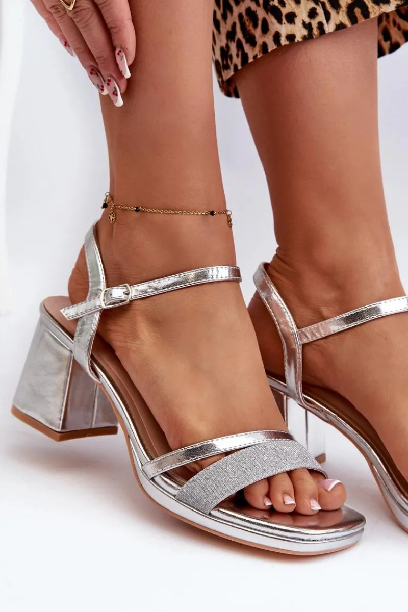 Sandały damskie wykonane z eko skóry. Osadzone na obcasie w postaci słupka. Zapinane na regulowany pasek ze sprzączką, gwarantują idealne dopasowanie do stopy. Z przodu dwa paseczki, dodatkowo jeden obszyty jest błyszczącą nicią, dodając im delikatnego blasku. Te sandały będą doskonałym uzupełnieniem każdej letniej stylizacji! Przy wyborze rozmiaru prosimy sugerować się tabelą rozmiarów.