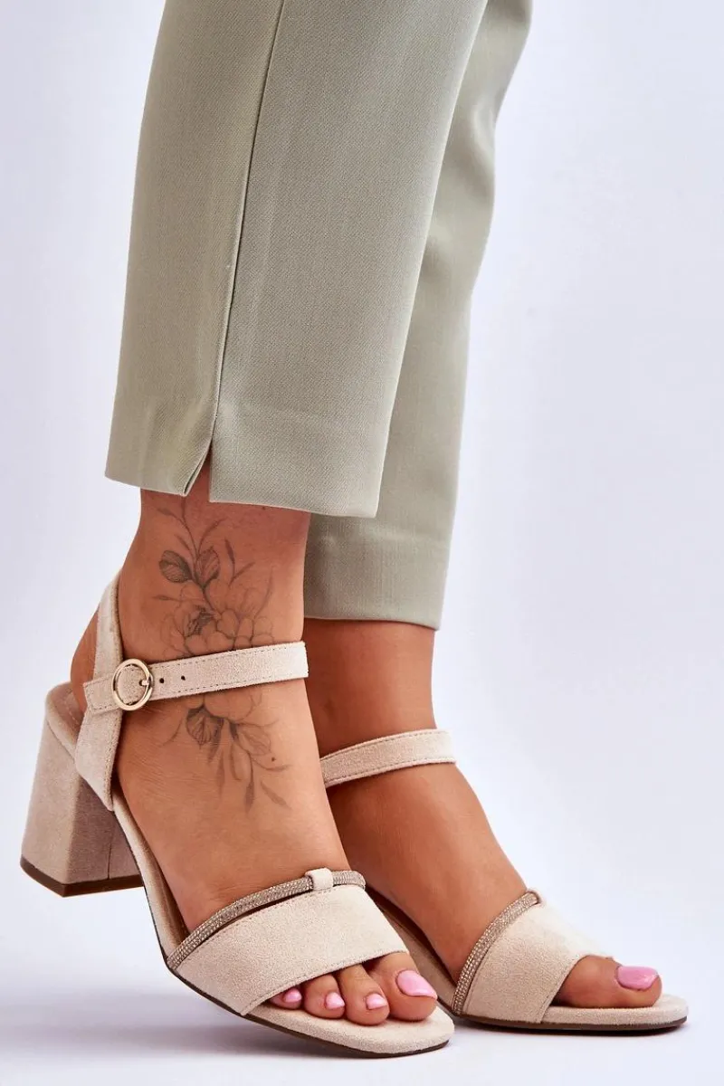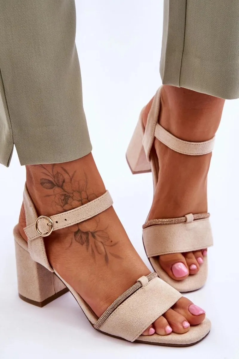 Damskie sandałki na obcasie w postaci słupka. Model ten został wykonany z miłego w dotyku eko zamszu. Sandałki zapinane na regulowany pasek ze sprzączką. Wkładka została wykonana z naturalnej skóry. Jest niezwykle miękka i wygodna w użytkowaniu. Koniecznie powinnaś je mieć! Przy wyborze rozmiaru prosimy sugerować się tabelą rozmiarów.