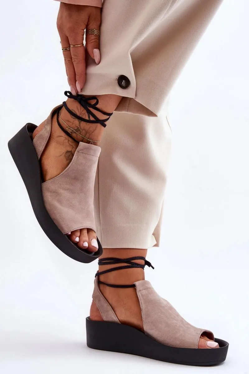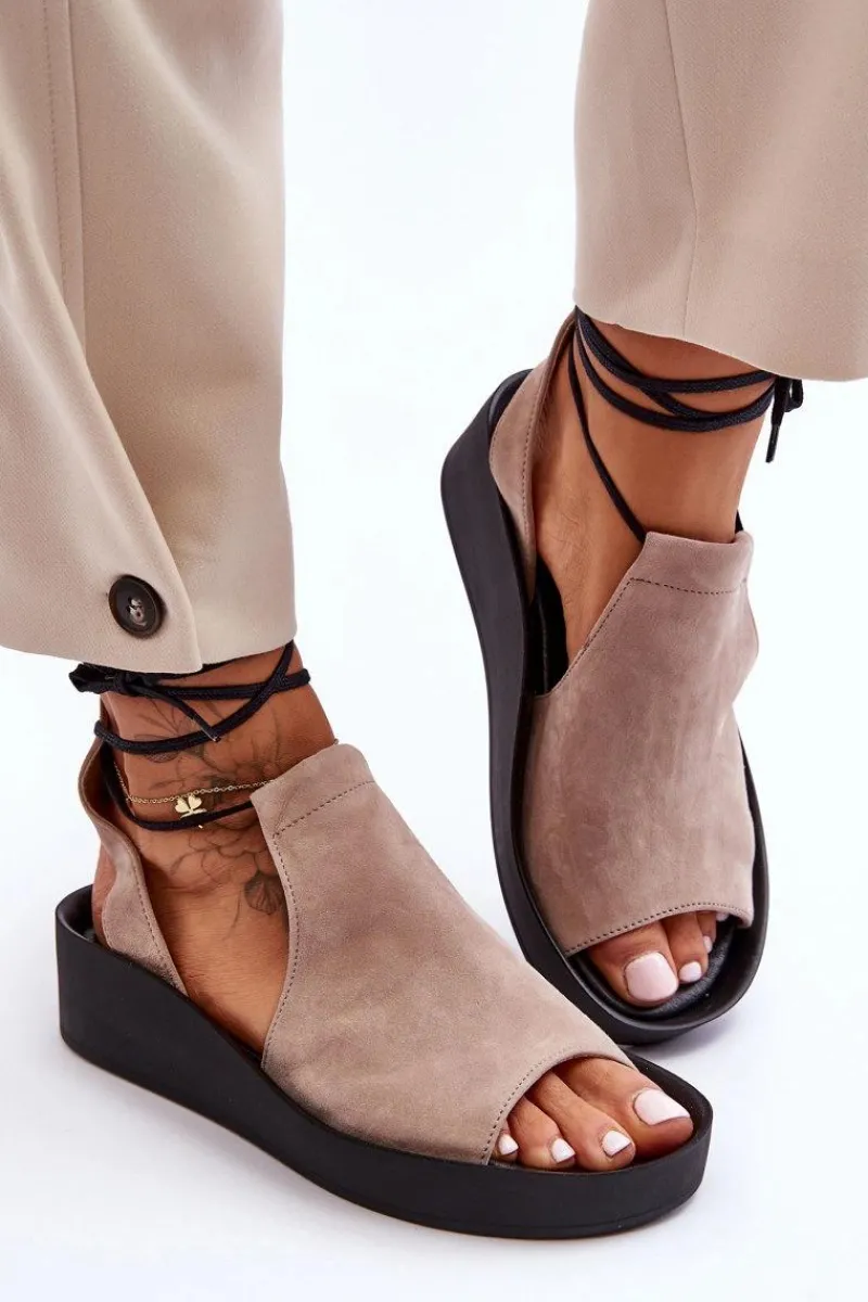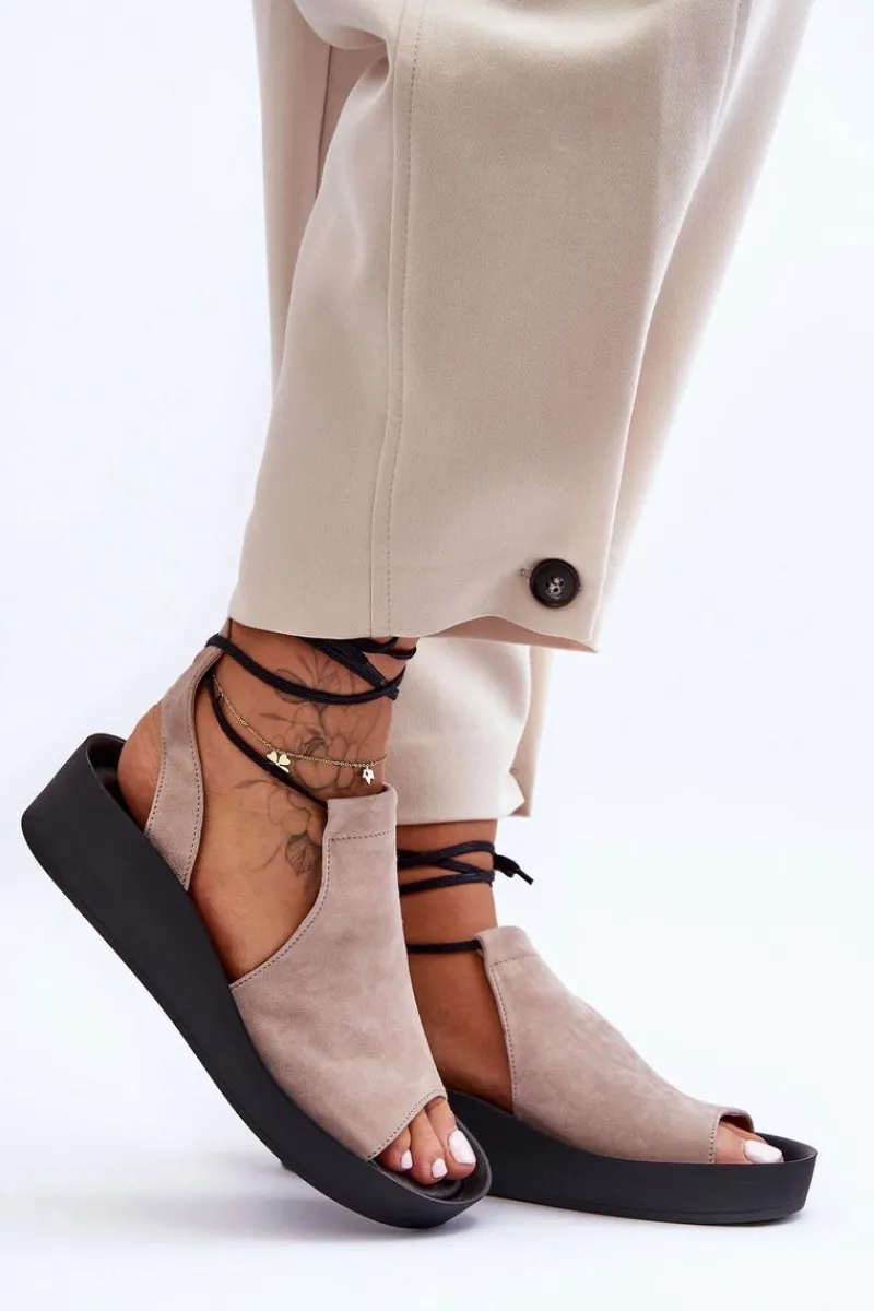 Niezwykle wygodne i modne sandałki damskie zostały wykonane z naturalnej skóry. Model wiązany, z cholewką za kostkę. Sandałki posiadają miękką, skórzaną wkładkę. Sandały osadzono na platformie oraz niewysokim koturnie. Ten fason z pewnością przypadnie Ci do gustu! Przy wyborze rozmiaru prosimy kierować się tabelą rozmiarów.