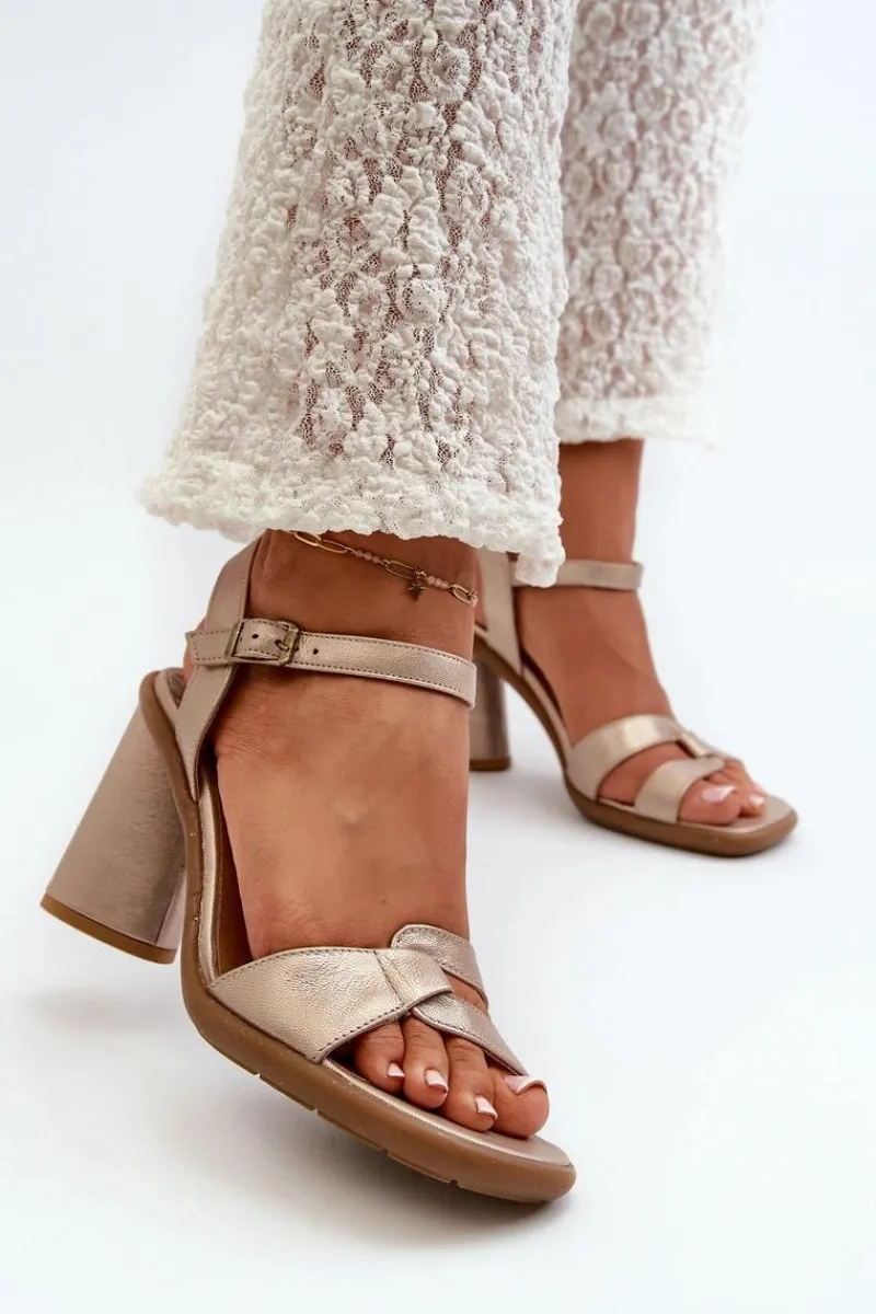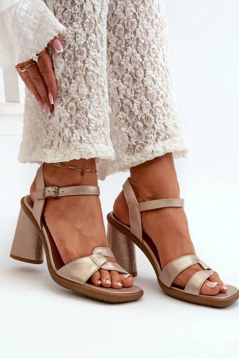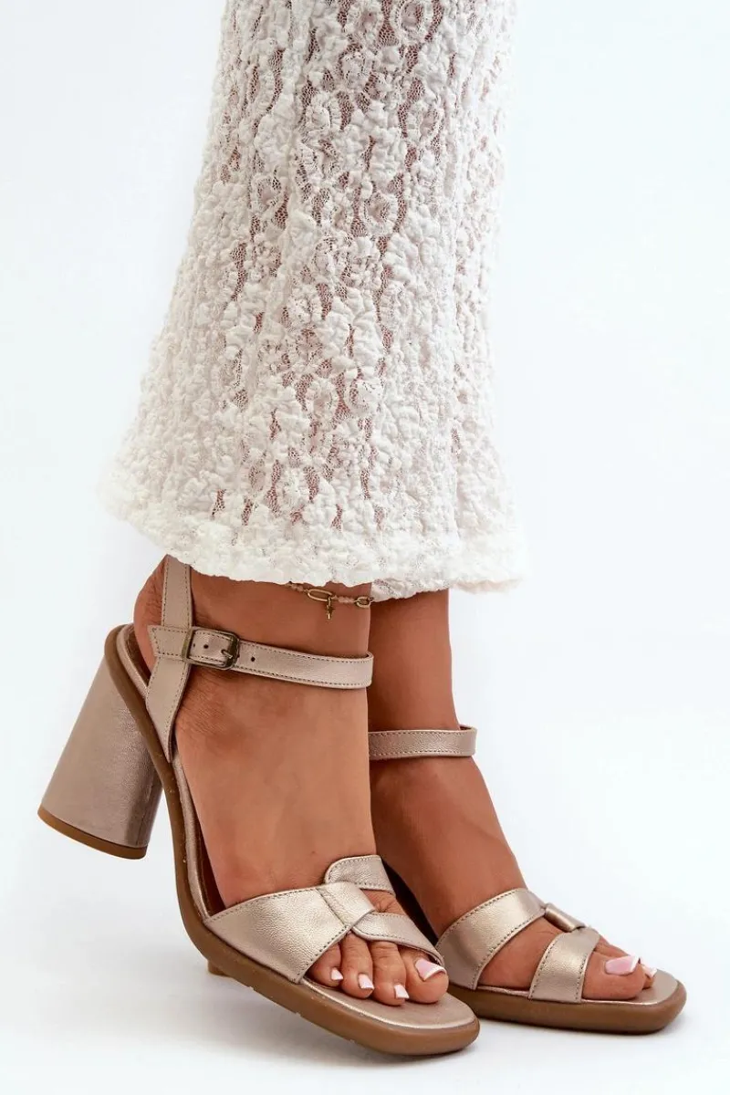 Modne, damskie sandały zostały wykonane z naturalnej skóry. Model ten posiada miękką wkładkę, która jest niezwykle wygodna podczas użytkowania. Sandałki osadzono obcasie w postaci trójkątnego słupka. Są zapinane na regulowany pasek ze sprzączką. Idealne obuwie na różnego rodzaju uroczystości czy ważne spotkania w letnie dni! Przy wyborze rozmiaru prosimy sugerować się tabelą rozmiarów.