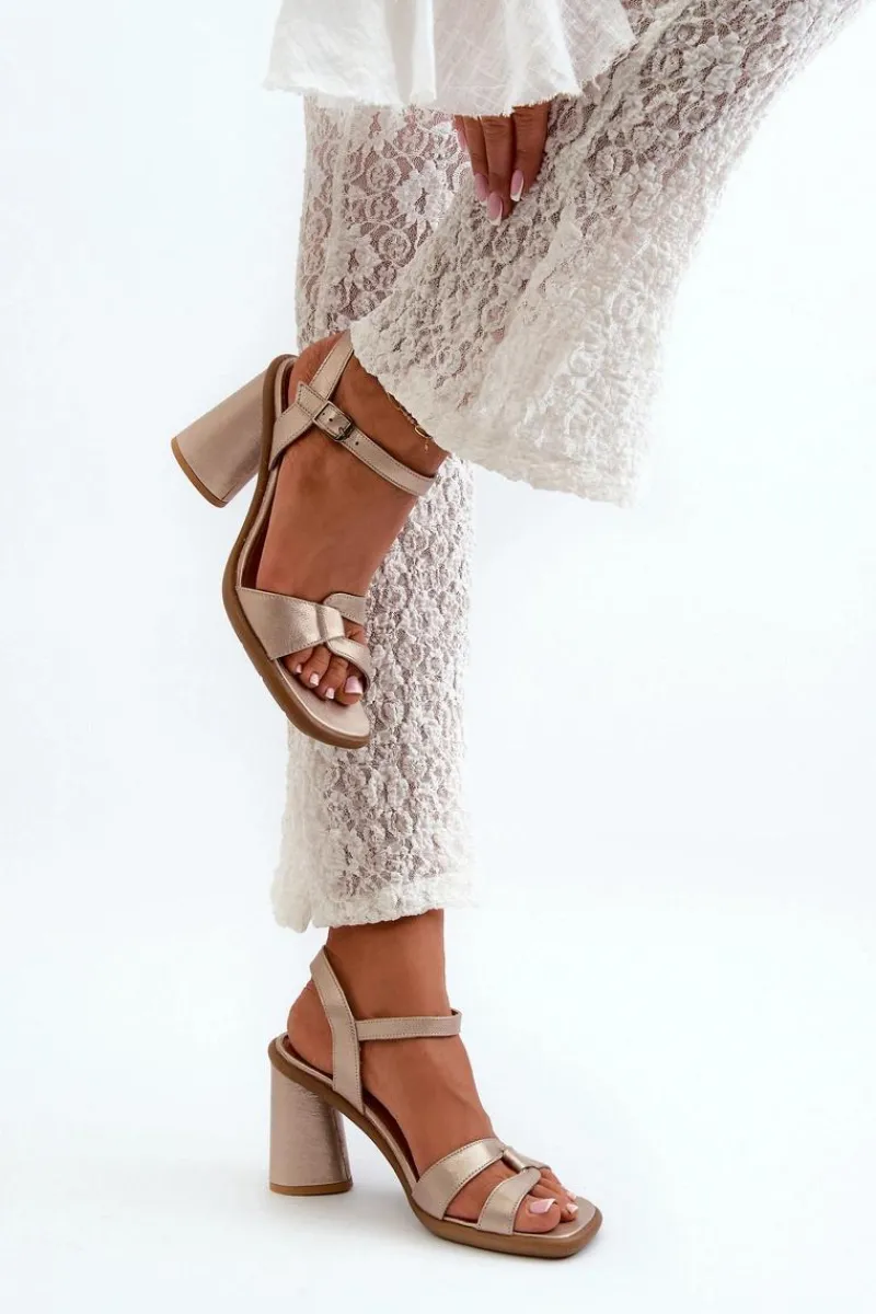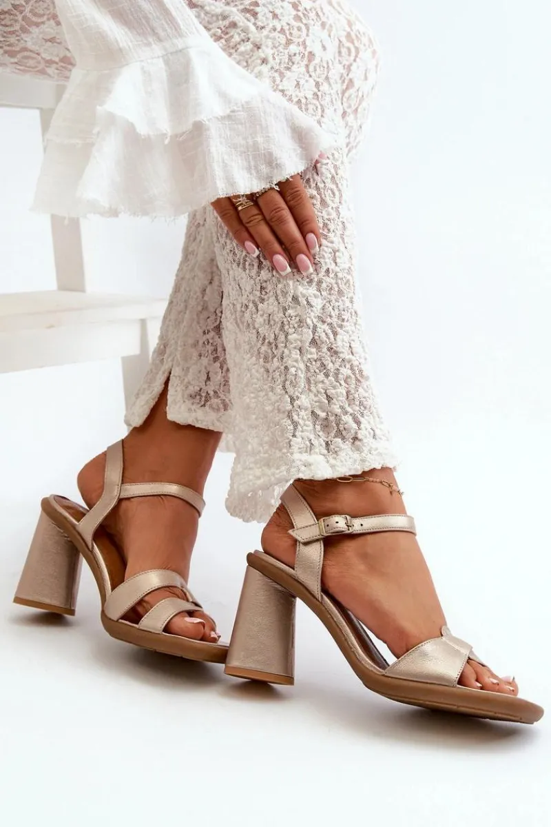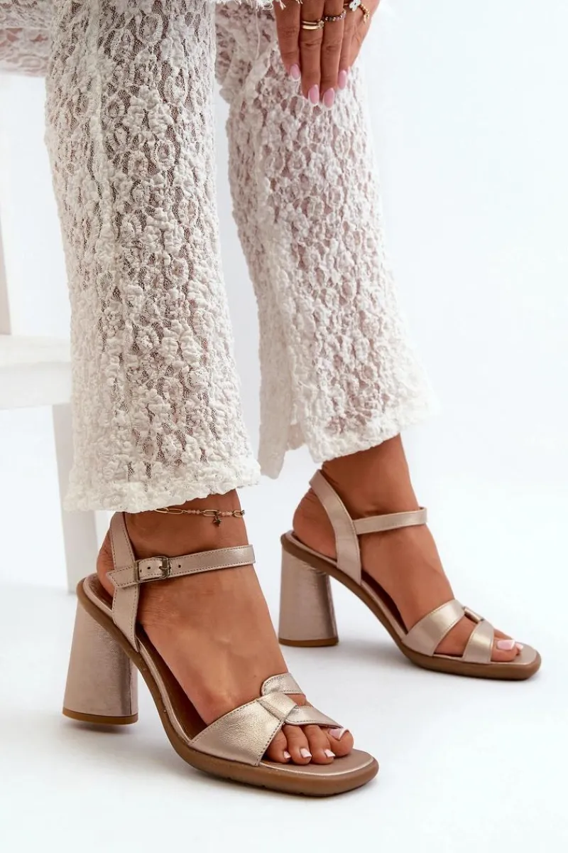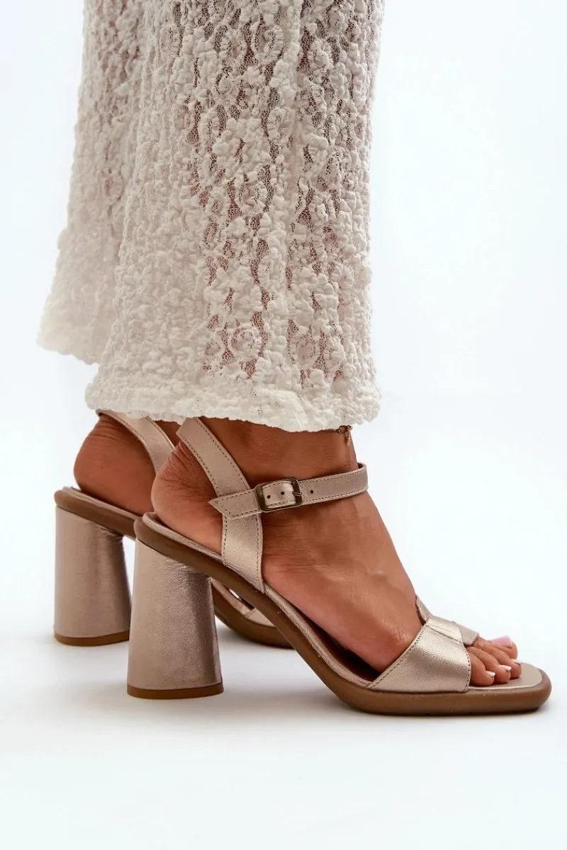 Modne, damskie sandały zostały wykonane z naturalnej skóry. Model ten posiada miękką wkładkę, która jest niezwykle wygodna podczas użytkowania. Sandałki osadzono obcasie w postaci trójkątnego słupka. Są zapinane na regulowany pasek ze sprzączką. Idealne obuwie na różnego rodzaju uroczystości czy ważne spotkania w letnie dni! Przy wyborze rozmiaru prosimy sugerować się tabelą rozmiarów.