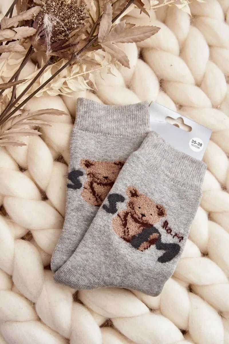 Ciepłe skarpety damskie idealne na mroźne dni. Model z naszywką w postaci misia. Lekki ściągacz sprawi, że będą idealnie dopasowane do tęgości nogi. Koniecznie powinnaś je mieć!