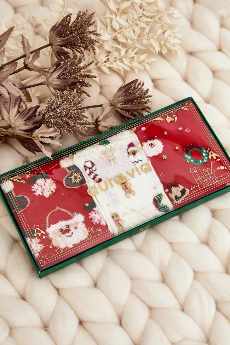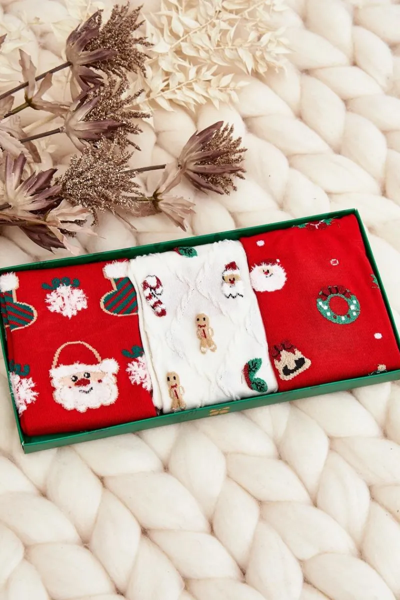 Świetny zestaw trzech par damskich skarpet w świąteczne wzory. Idealny prezent na święta dla każdego! Wykonane z wysokiej jakości bawełny. Posiadają delikatny ściągacz, który odpowiednio dopasuje się do tęgości nogi.