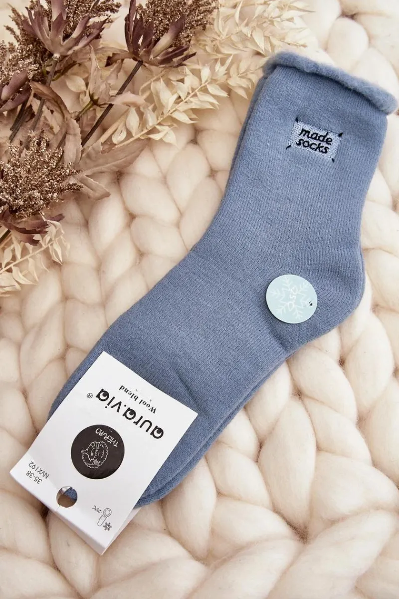 Ciepłe skarpety damskie idealne na mroźne dni. Model z małą naszywką. Lekki ściągacz sprawi, że będą idealnie dopasowane do tęgości nogi. Koniecznie powinnaś je mieć!