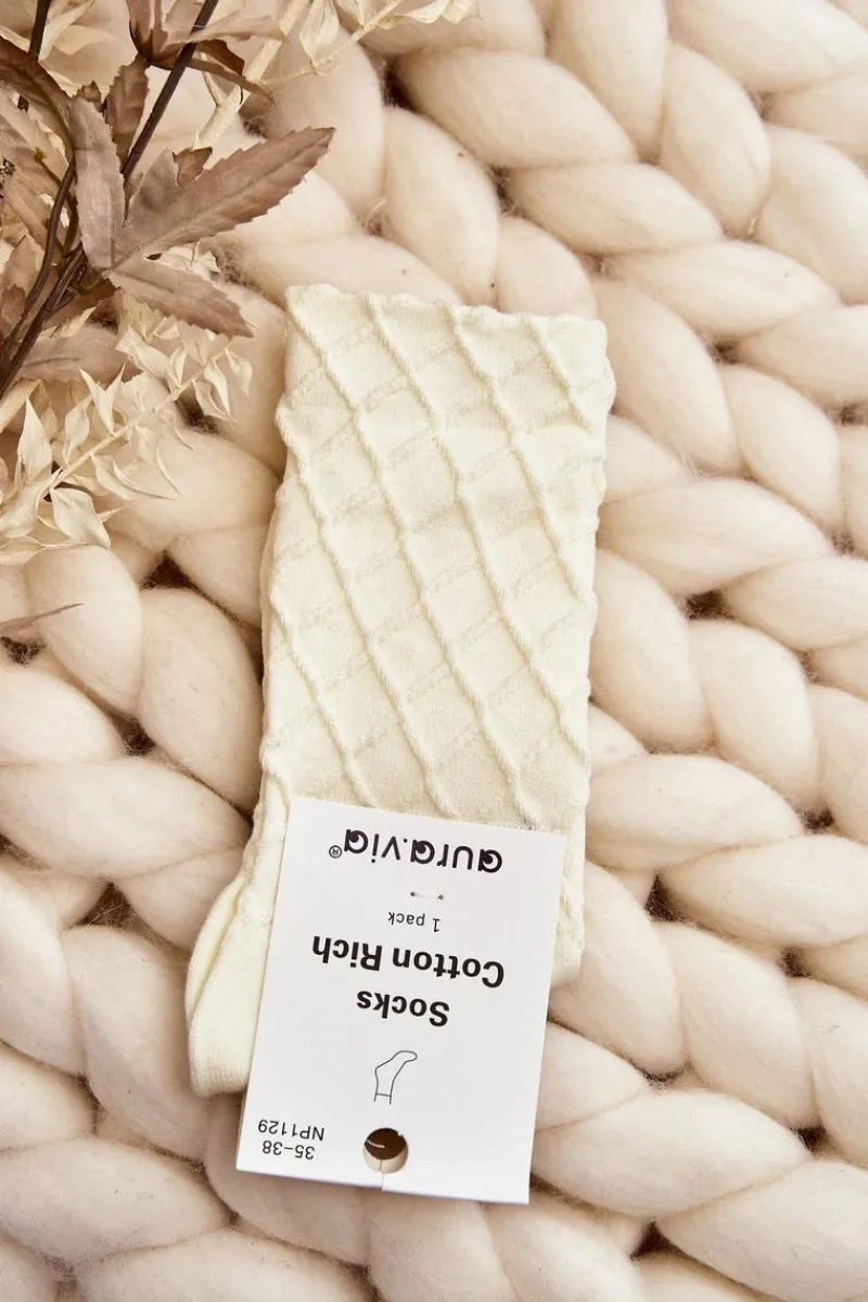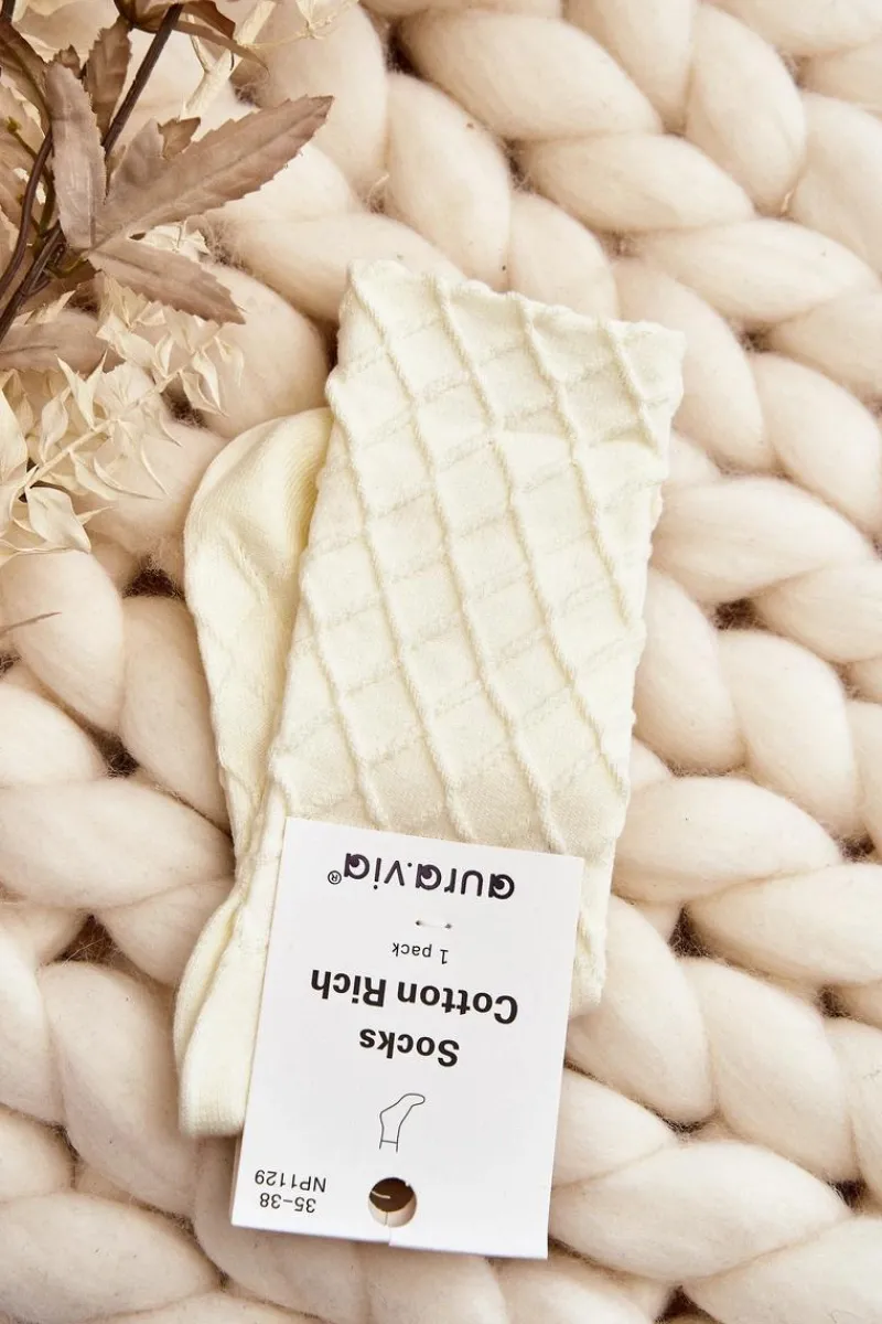 Damskie skarpety z ozdobnym tłoczeniem, świetnie sprawdzą się podczas chłodnych dni. Wykonane głównie z bawełny. Idealne jako dodatek do świątecznego prezentu. Koniecznie powinnaś je mieć!