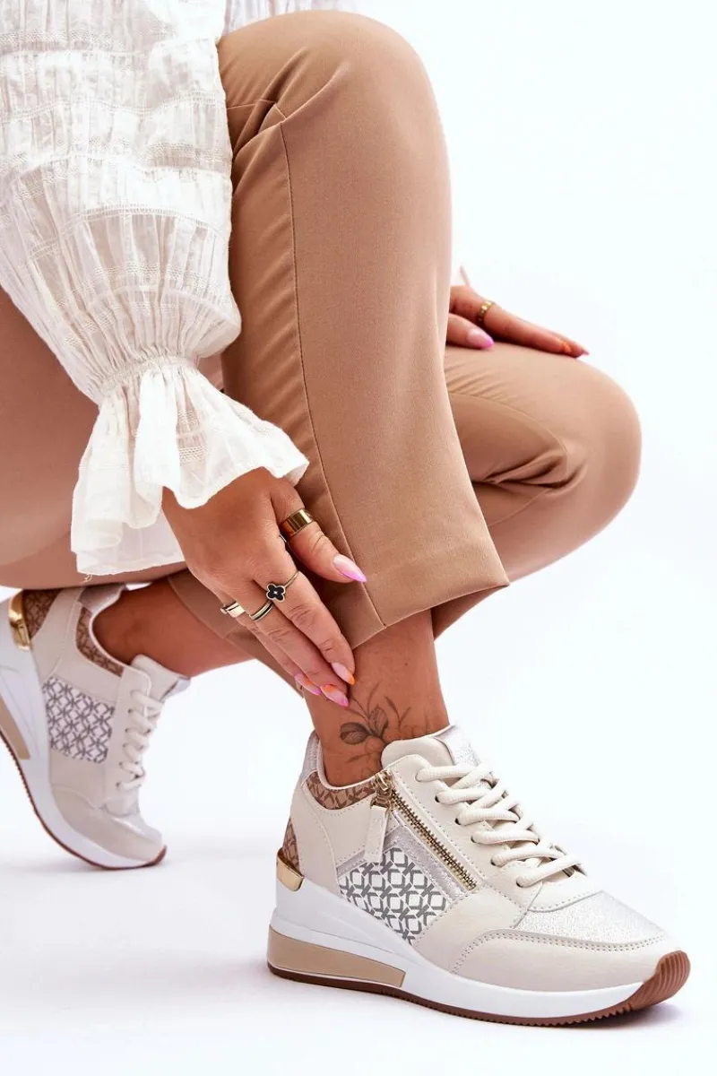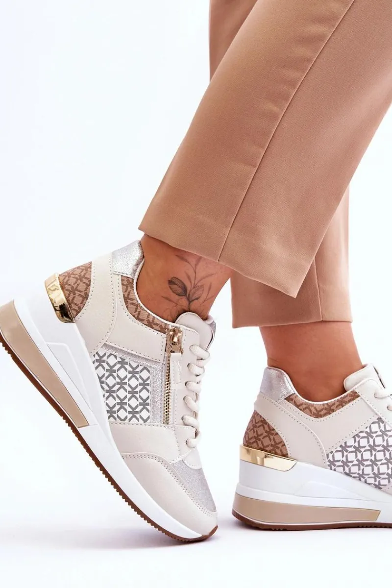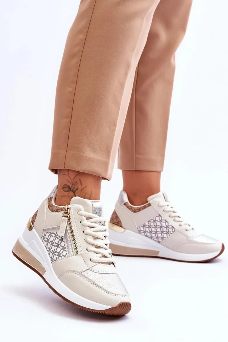 Modne, damskie buty sportowe zostały wykonane z eko skóry. Posiadają lustrzany element przy obcasie oraz ozdobny, odpinany zamek. Model ten został osadzony na koturnie z platformą. Buty posiadają klasyczne sznurowanie. Miękka wkładka w tych butach jest materiałowa. Zapiętek w tych butach jest delikatnie usztywniany. Przy wyborze rozmiaru prosimy kierować tabelą rozmiarów.