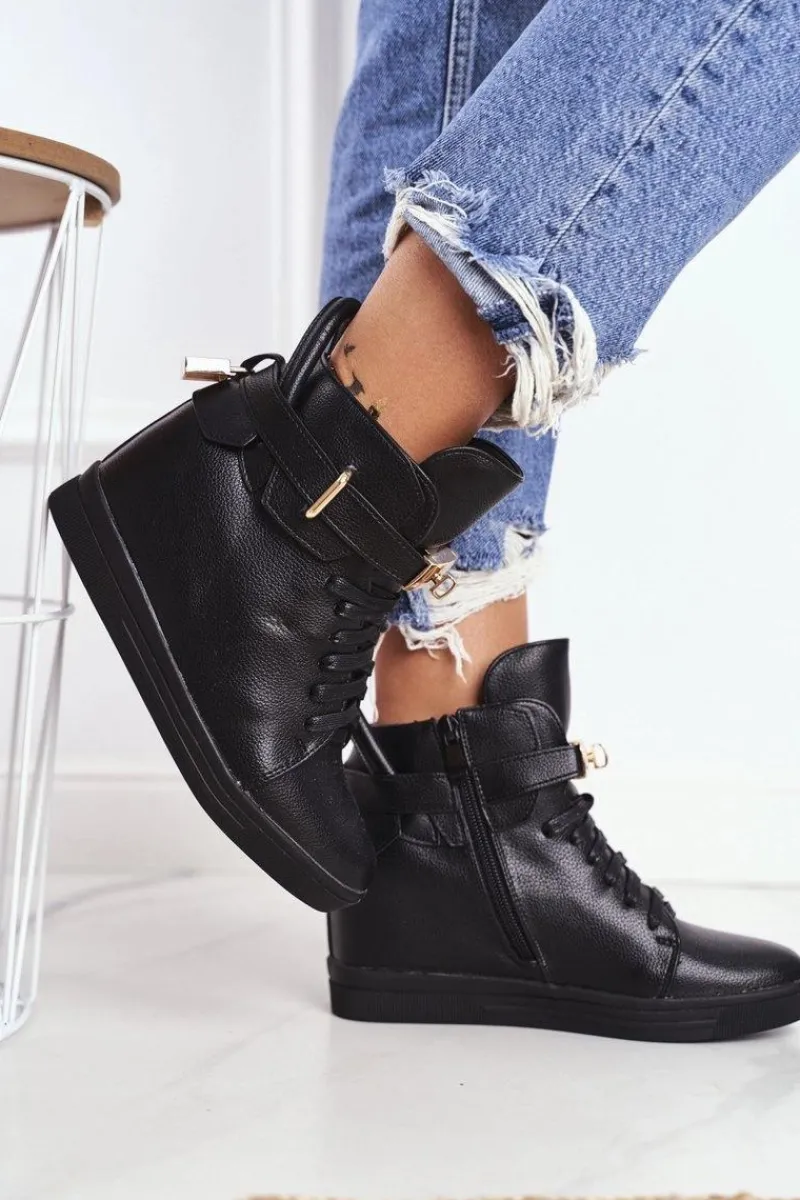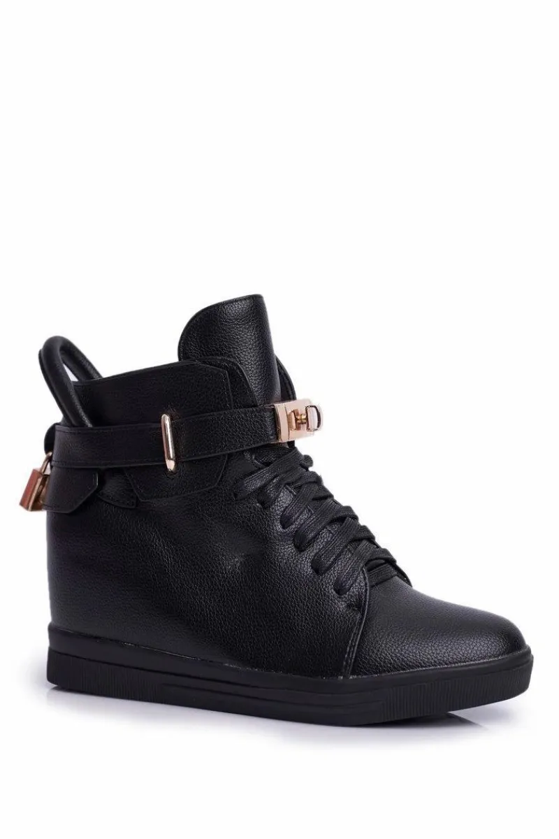 Sneakersy Damskie>Boto Sneakersy Damskie Na Koturnie Złota Kłódka Całe Czarne Tersey