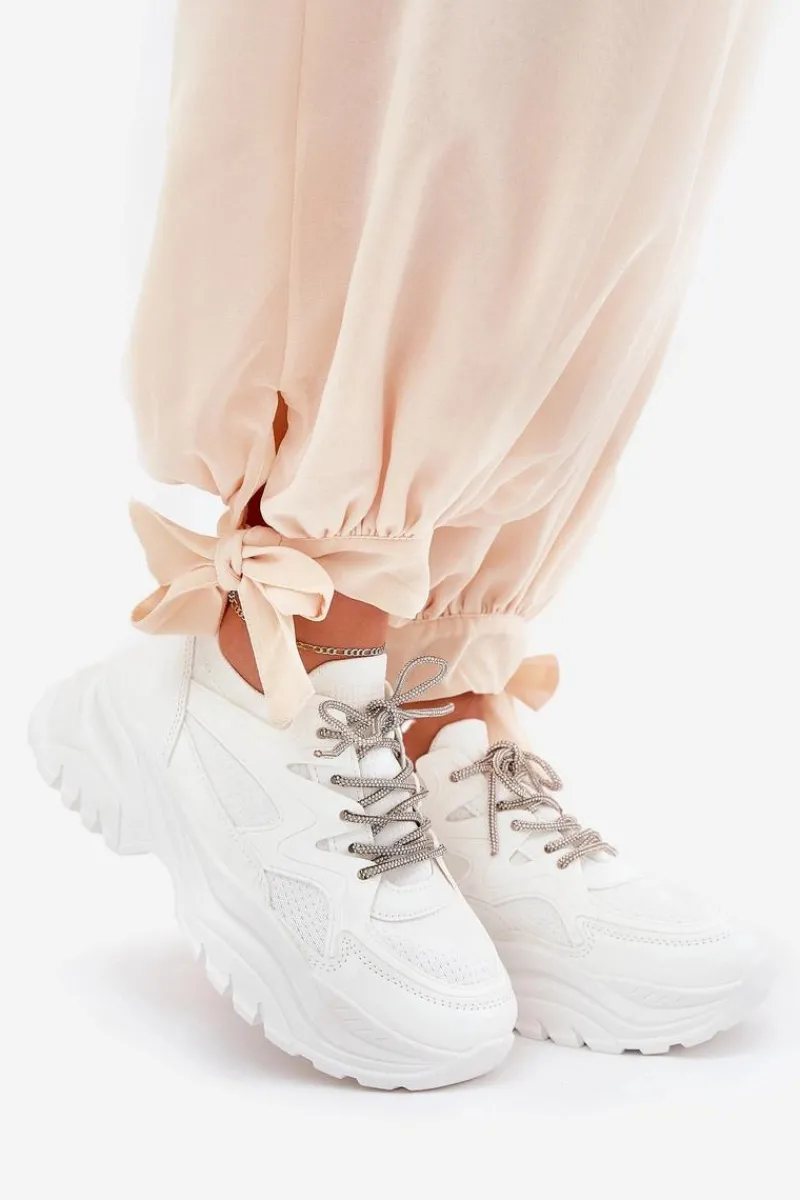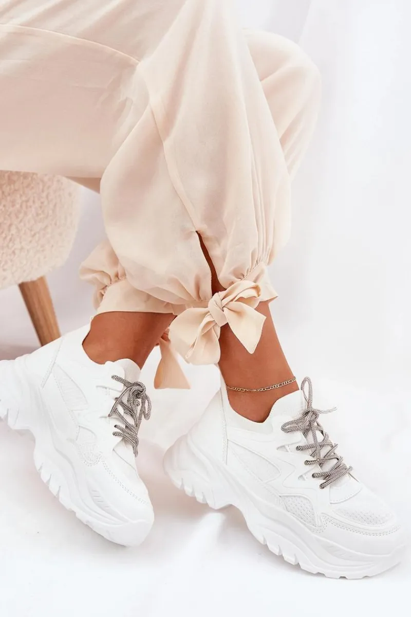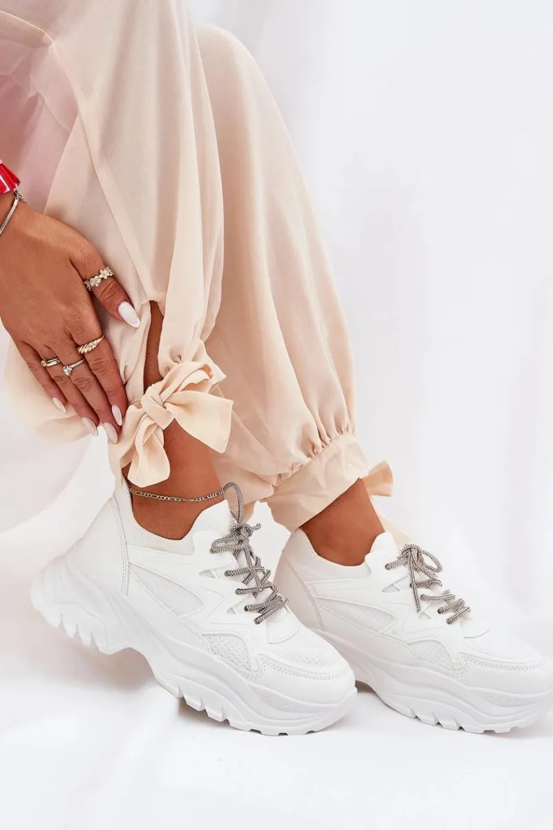 Sneakersy na masywnej podeszwie to idealny wybór dla kobiet, które kochają styl i wygodę! Model wsuwany z ozdobnym sznurowaniem. Miękka wkładka z pianki, dodatkowo pokryta materiałem zapewni wygodę. Ten niezwykle modny fason powinien być Twój! Przy wyborze rozmiaru prosimy kierować tabelą rozmiarów.