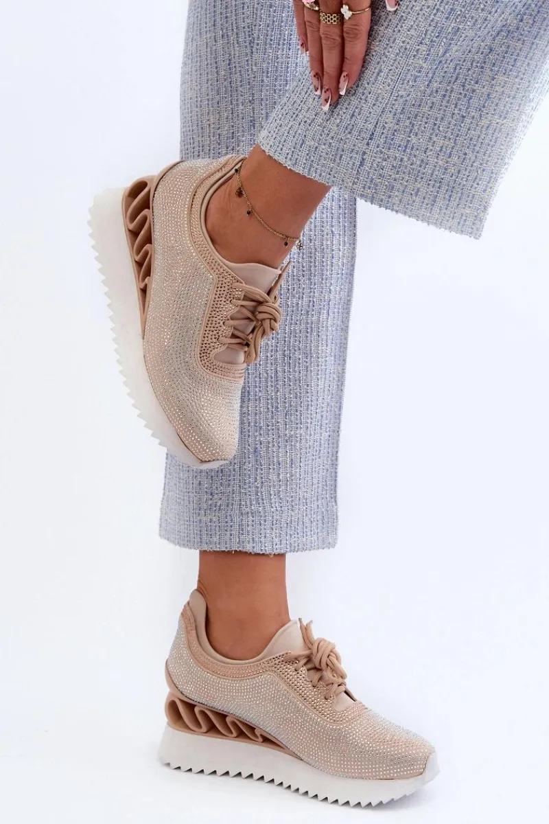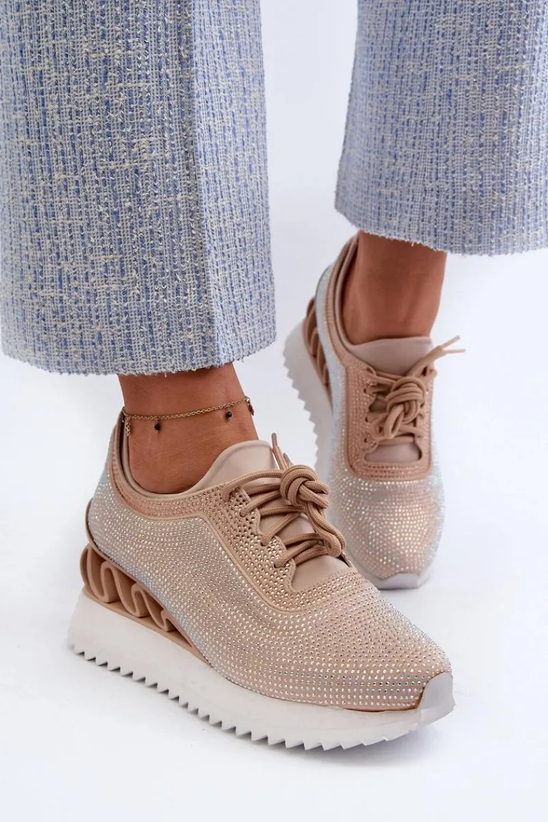 Sneakersy damskie zdobione cyrkoniami dodają blasku na każdym kroku. Osadzone na koturnie zapewniają dodatkową wysokość i stabilność. To obuwie, które nie tylko prezentuje się wyjątkowo, ale także zapewnia komfort noszenia przez cały dzień. Idealne na wiele różnych okazji, od casualowych spacerów po wieczorne wyjścia. Przy wyborze rozmiaru prosimy kierować tabelą rozmiarów.