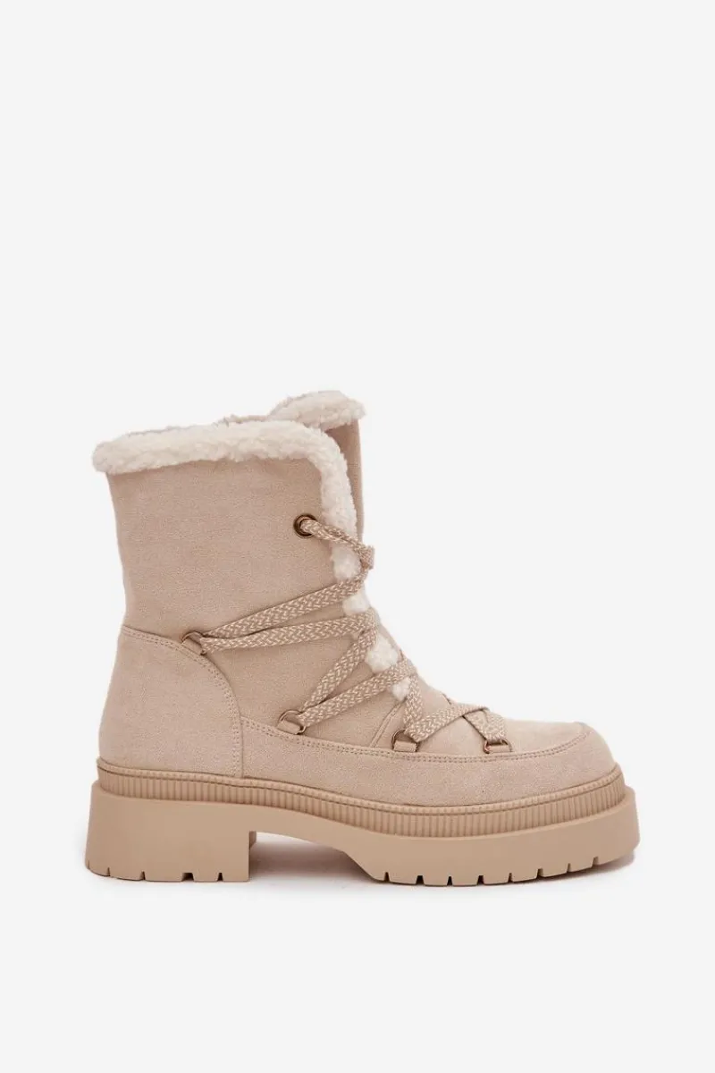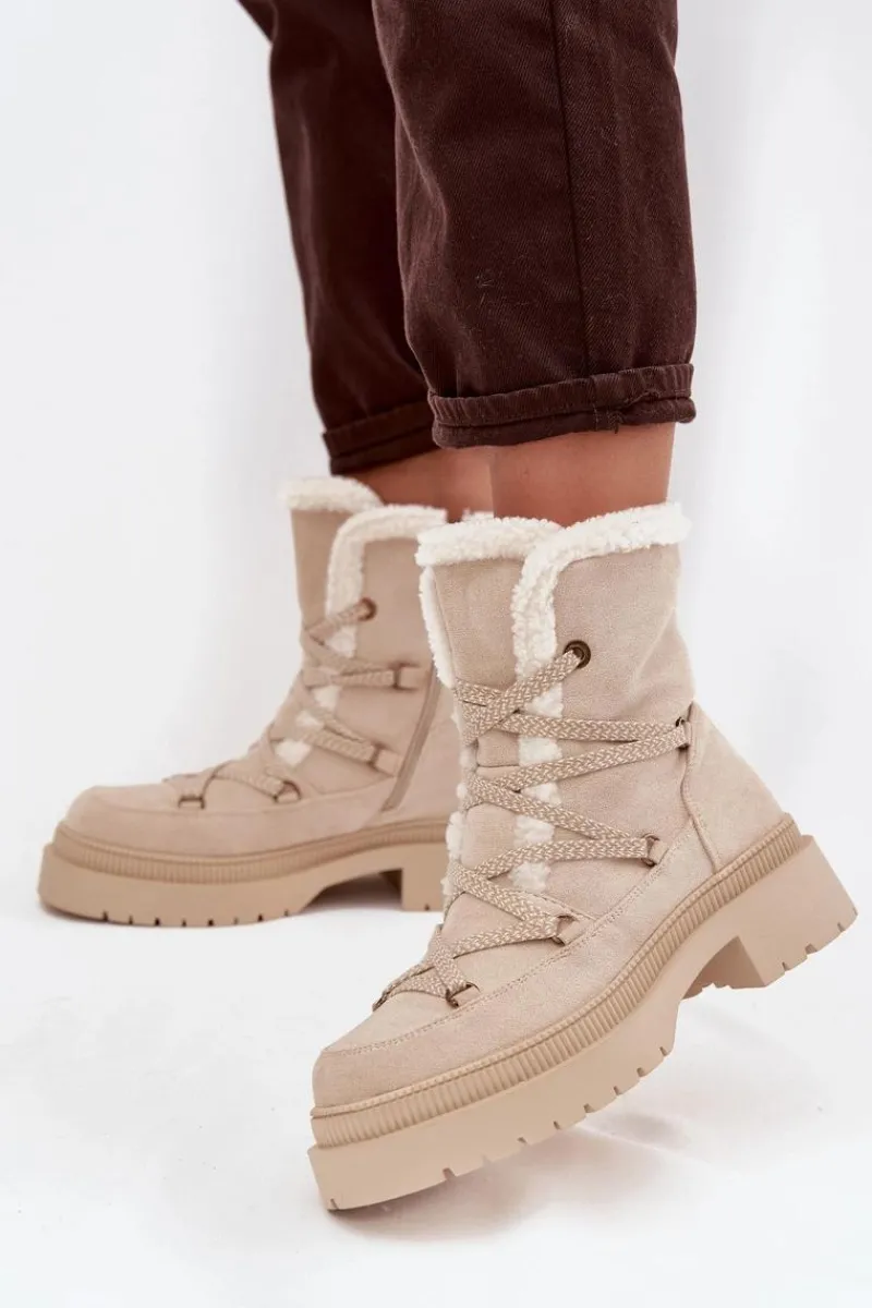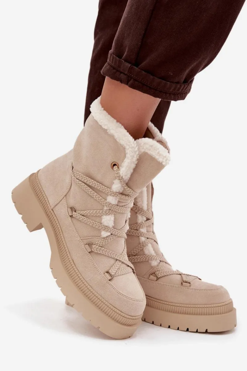 Damskie śniegowce wykonane z eko zamszu to idealna propozycja na zimowe dni. Model zapinany na zamek z dodatkowym wiązaniem zapewnia doskonałe dopasowanie oraz wygodę podczas noszenia. Wnętrze butów zostało ocieplone kocem obuwniczym, który gwarantuje ciepło nawet w mroźne dni. Górną część cholewki ozdobiono miękkim, syntetycznym kożuszkiem, dodającym całości przytulnego i stylowego akcentu. To praktyczne, a zarazem modne śniegowce, które świetnie sprawdzą się zarówno na zimowych spacerach, jak i w codziennych stylizacjach. Przy wyborze rozmiaru prosimy sugerować się tabelą rozmiarów.