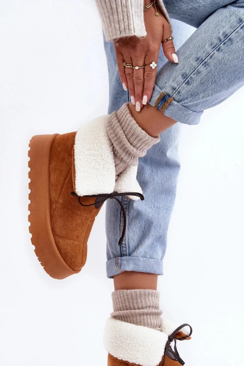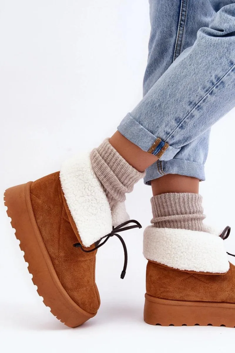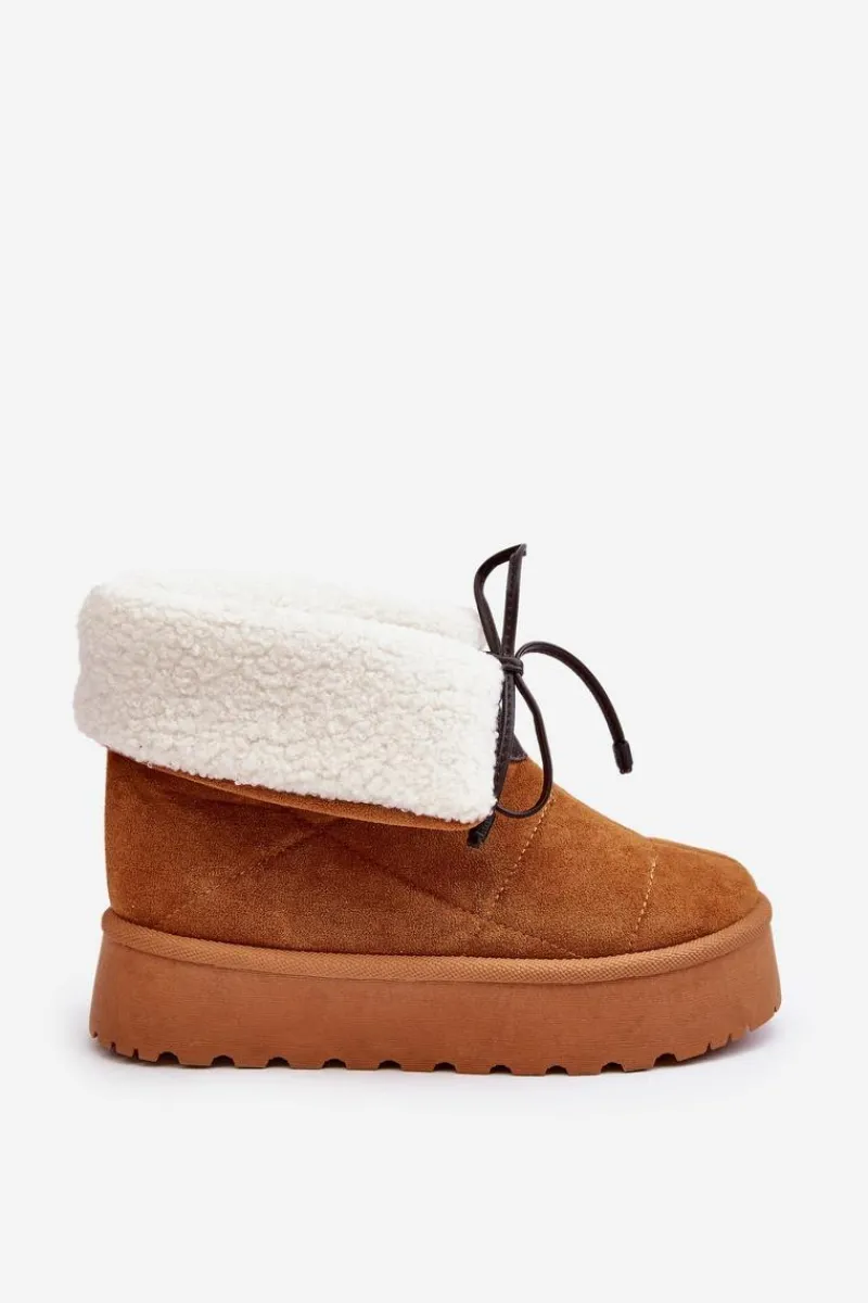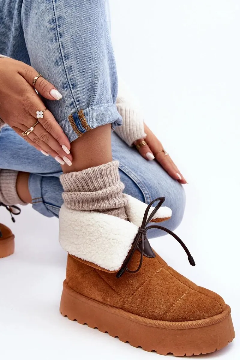 Damskie śniegowce idealnie sprawdzą się podczas mroźnych dni. Wykonane z eko zamszu. Osadzone na grubej platformie. Ocieplone kożuchem. Model wsuwany. Cholewka ozdobiona wiązaniem. Przy wyborze rozmiaru prosimy sugerować się tabelą rozmiarów.