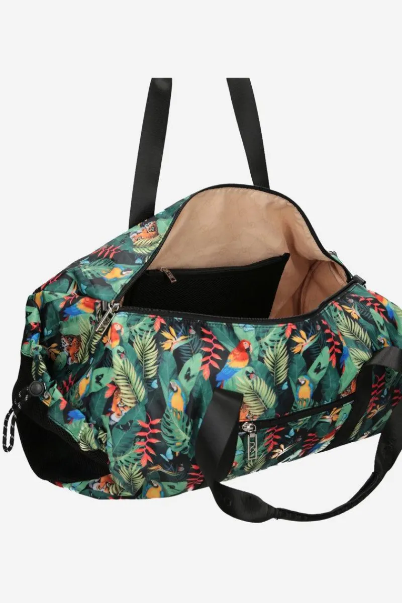Torba została wykonana jest z tkaniny odpornej na zabrudzenia w przepiękny print. Posiada odpinany, regulowany pasek. Torba ma jedną komorę zamykaną na suwak, natomiast wewnątrz znajdują się dwie kieszenie również zapinane na suwak i paseczek z karabińczykiem umożliwiający zapięcie kluczy. Torba posiada praktyczne uchwyty. Na zewnątrz znajdują się dwie kieszenie zamykane na sznureczek ze ściągaczem oraz dwie kieszenie zamykane na suwak.