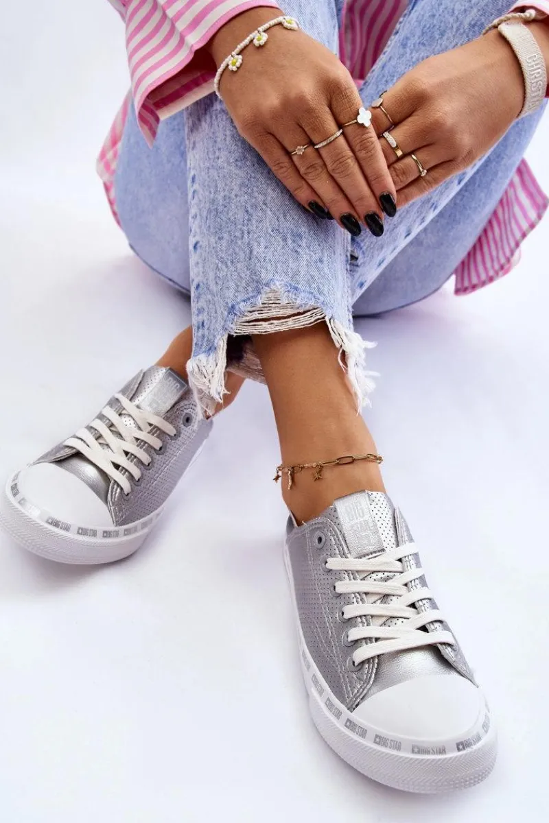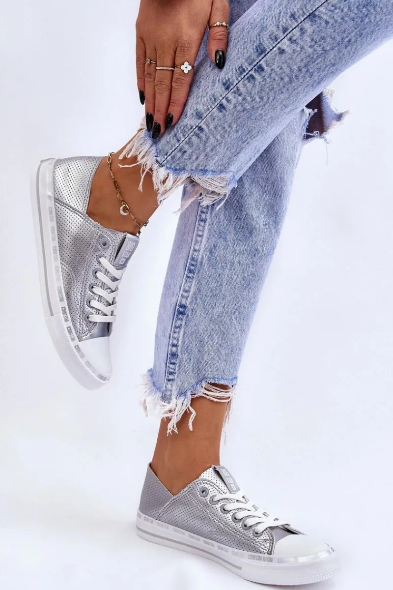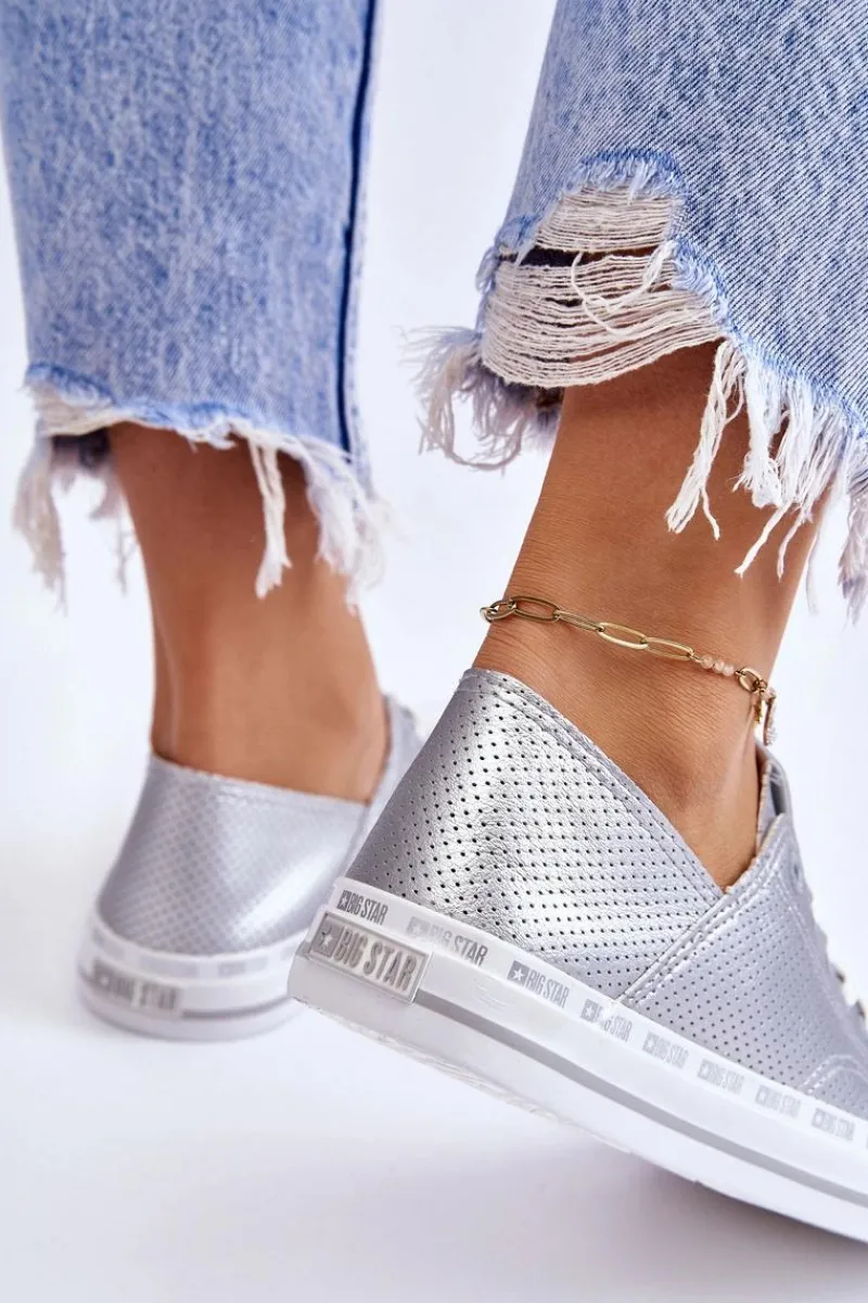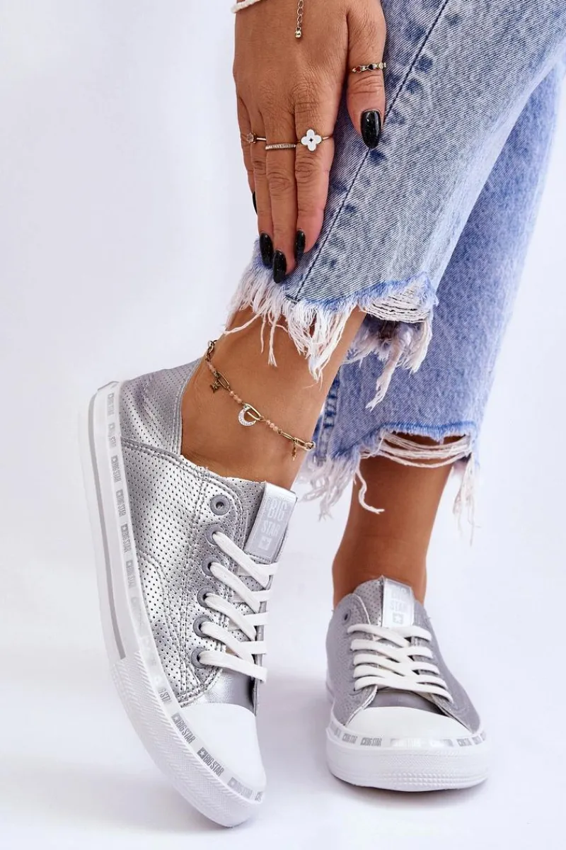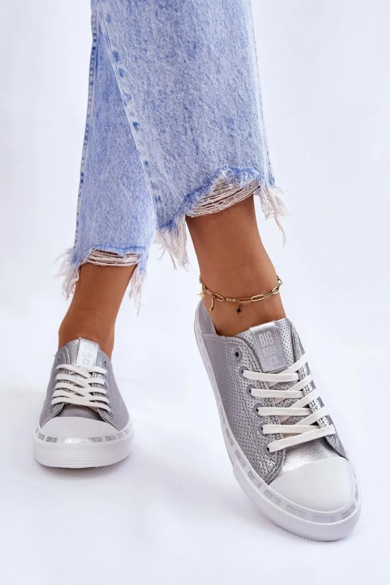 Klasyczne, damskie trampki wykonane z eko skóry z perforacją na cholewce. Model ten posiada wzmocniony nosek. Zapiętek nie jest usztywniany. Logo marki Big Star zostało umieszczone na platformie. Ten model z pewnością przypadnie do gustu miłośniczkom modowych nowinek, wygody i komfortowego użytkowania. Koniecznie powinnaś je mieć! Przy wyborze rozmiaru prosimy sugerować się tabelą rozmiarów.