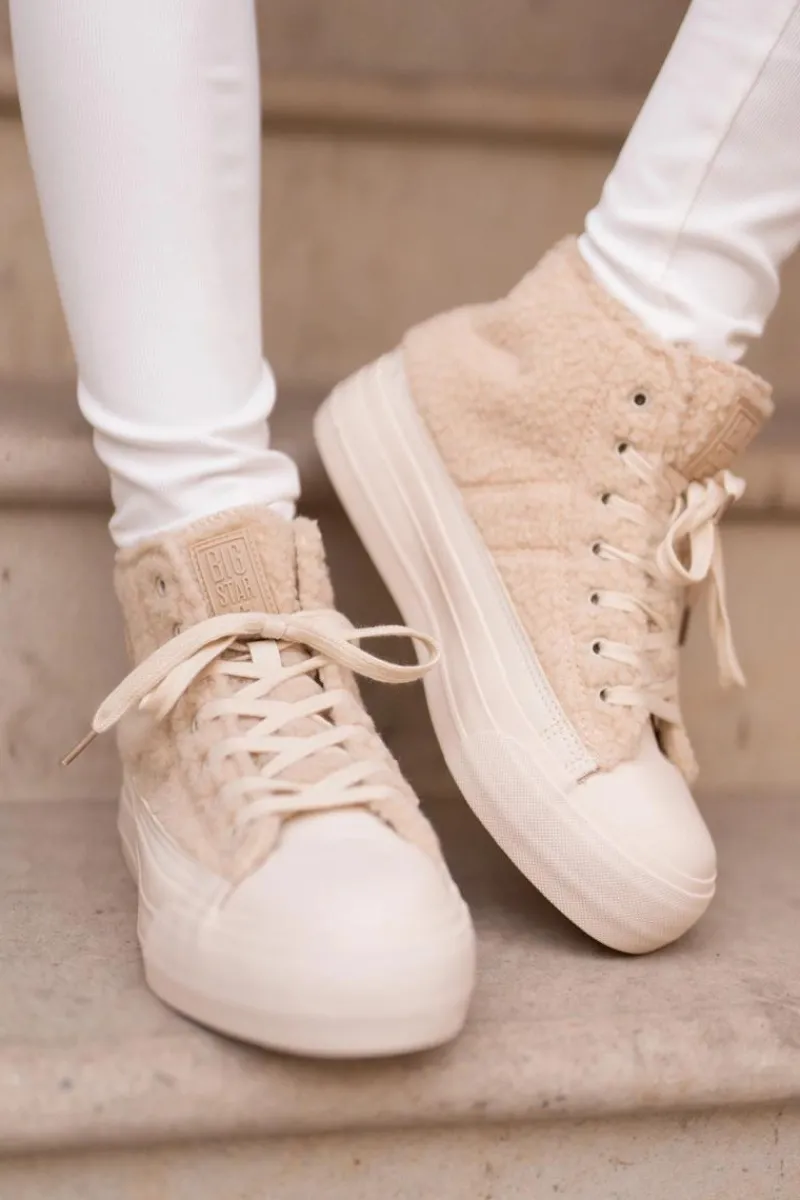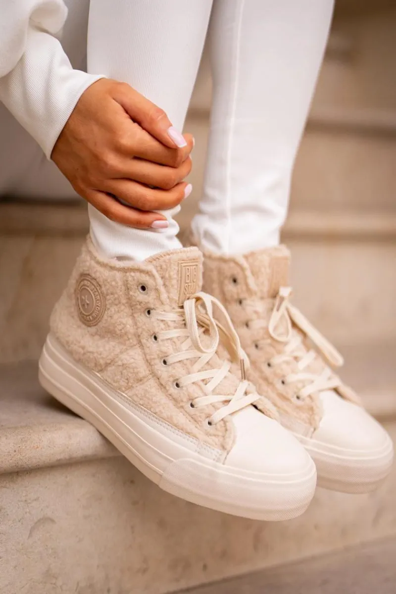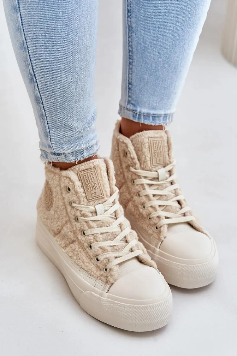 Damskie trampki marki BIG STAR Wykonane z modnym futerkiem typu baranek. Środek ocieplany kocem obuwniczym, co gwarantuje ciepło w chłodniejsze dni. Osadzone na platformie, która świetnie odizoluje od zimnego podłoża. Noski zaokrąglone. Ten stylowy fason powinnaś mieć w swojej jesienno-zimowej garderobie. Przy wyborze rozmiaru prosimy sugerować się tabelą rozmiarów.