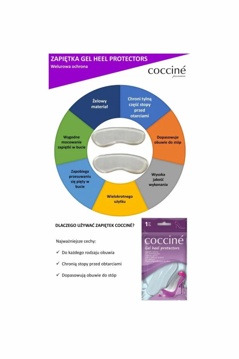 To małe rzeczy decydują o jakości życia i poczuciu komfortu. Często potrzeba naprawdę niewiele, aby w pełni cieszyć się każdym krokiem. Drobiazgi Cocciné – podpiętki, zapiętki, hamulce, paski i żelki – są tego doskonałym przykładem. Samoprzylepna, wykonana z miękkiego, sprężystego, żelu silikonowego. Niewidoczna w obuwiu. Zapiętki dostępne w dwóch wariantach rozmiarowych, rozmiar mały szczególnie zalecany dla kobiet, do obuwia ze zbyt sztywnym, za wysokim zapiętkiem, chroni piętę przed otarciem. Najbardziej nadaje się do sandałek z całą piętą, balerinek, czółenek, oprócz zapobieganiu obtarć, zapobiegają również wyskakiwaniu pięty przy zbyt luźnym obuwiu.