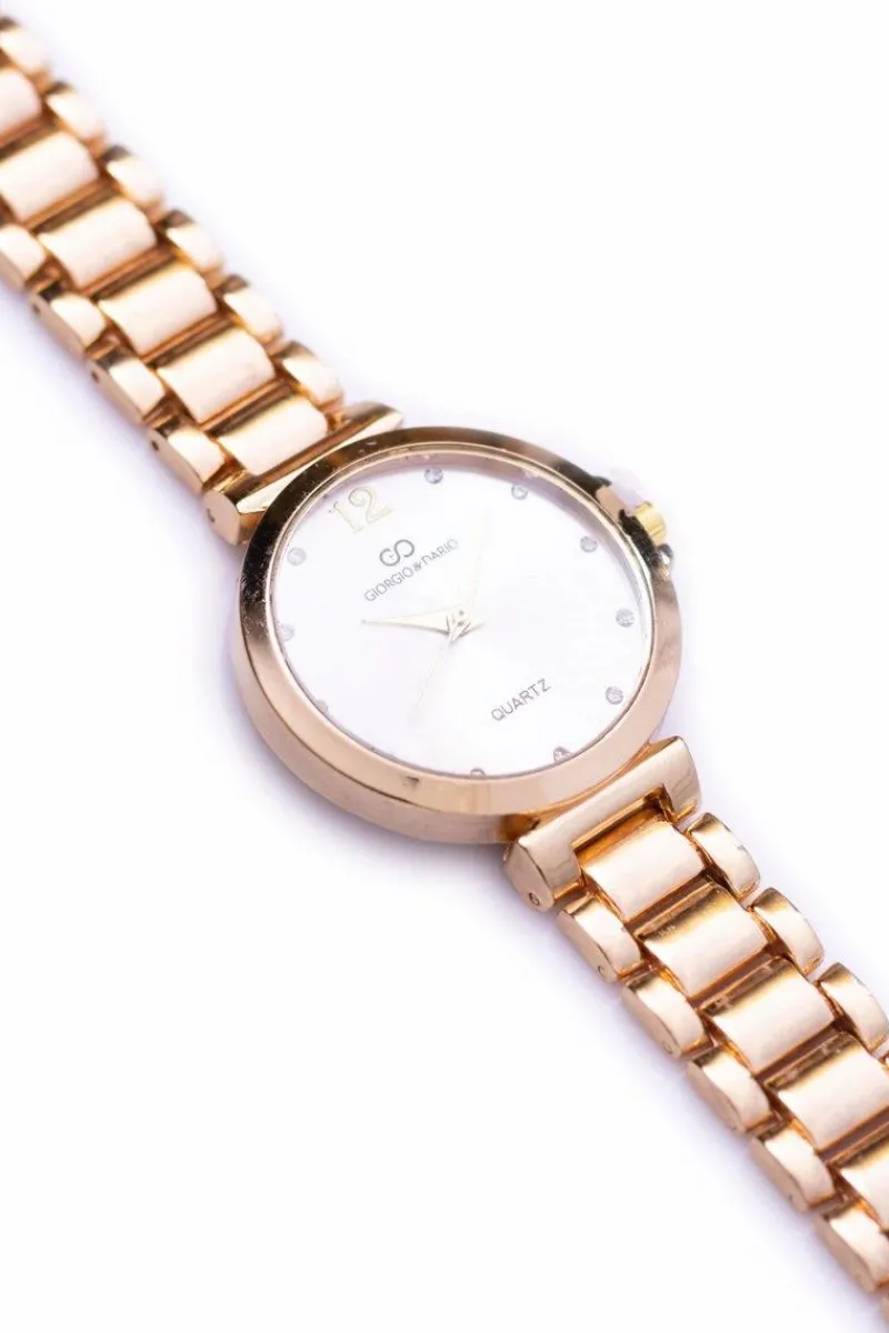 Zegarek Lagero marki Giorgio & Dario to gratka stworzona z myślą o kobietach kochających gustowne dodatki do swoich stylizacji. Zegarek posiada wypukłe szkiełko, które w połączeniu z piękną białą tarczą oraz nietypową skalą nadaje mu niecodziennego wyglądu. Bransoleta w kolorze koperty, wykonana ze stali chirurgicznej z możliwością łatwej i szybkiej regulacji. Wysoka jakość wykonania mechanizmu i koperty.