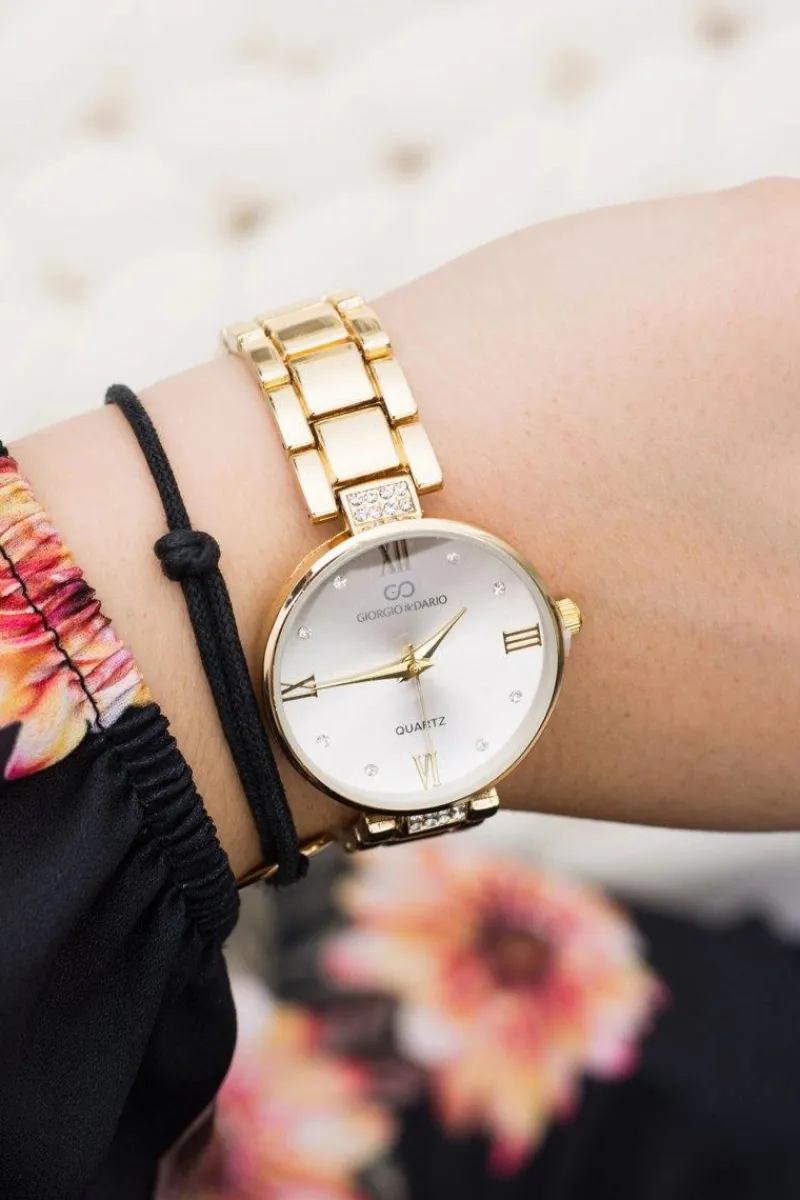 Stylowy damski zegarek marki Giorgio&Dario! Złota bransoleta wraz z ozdobnymi klejnotami to podstawa szyku! Piękna, prosta i elegancko wykończona koperta zadowoli każdą kobietę! Kup teraz w świetnej cenie! W zestawie pudełko w LOSOWYM kolorze oraz poduszeczka.